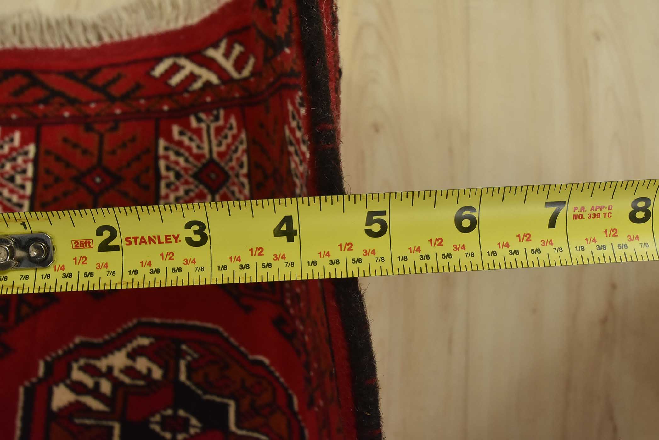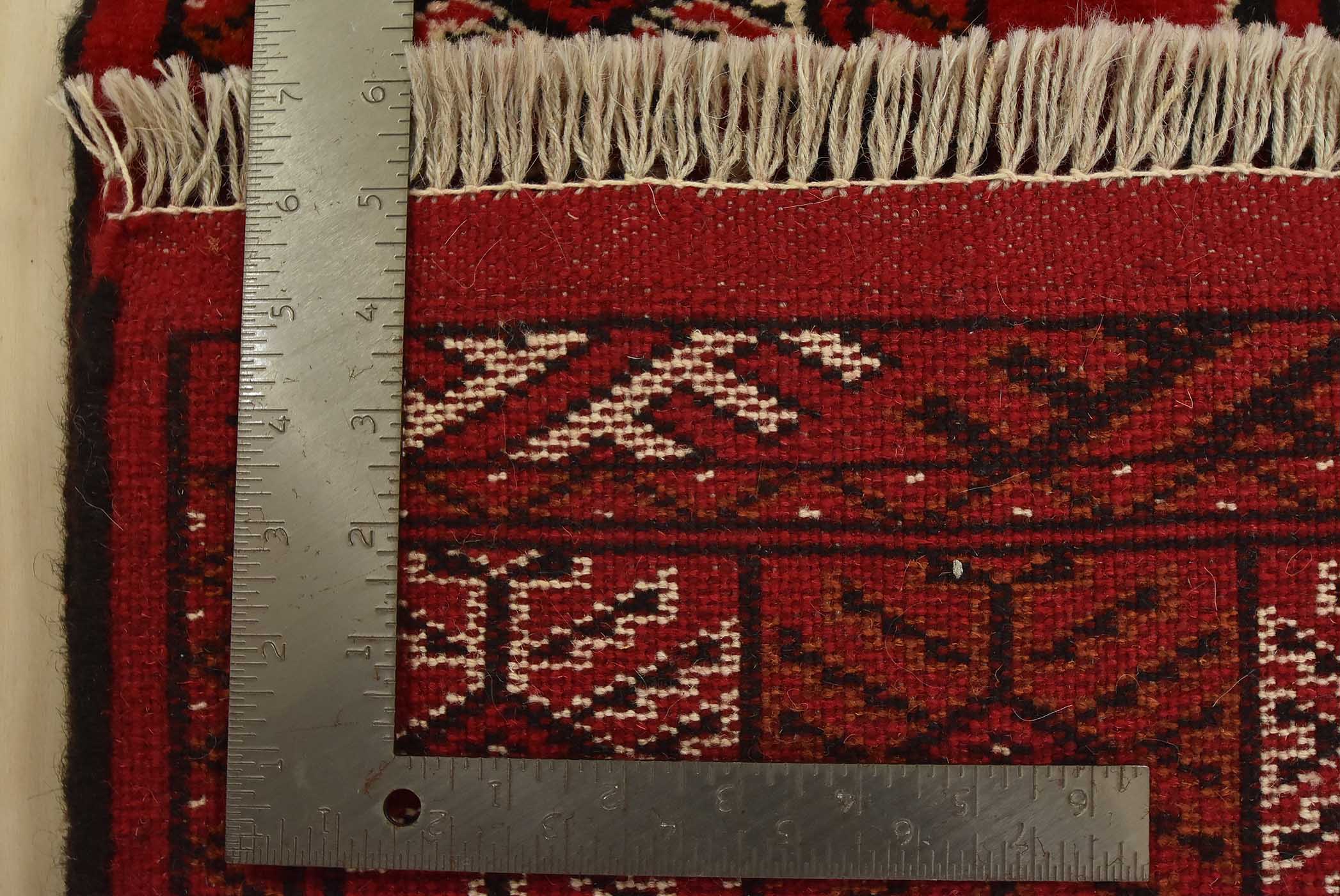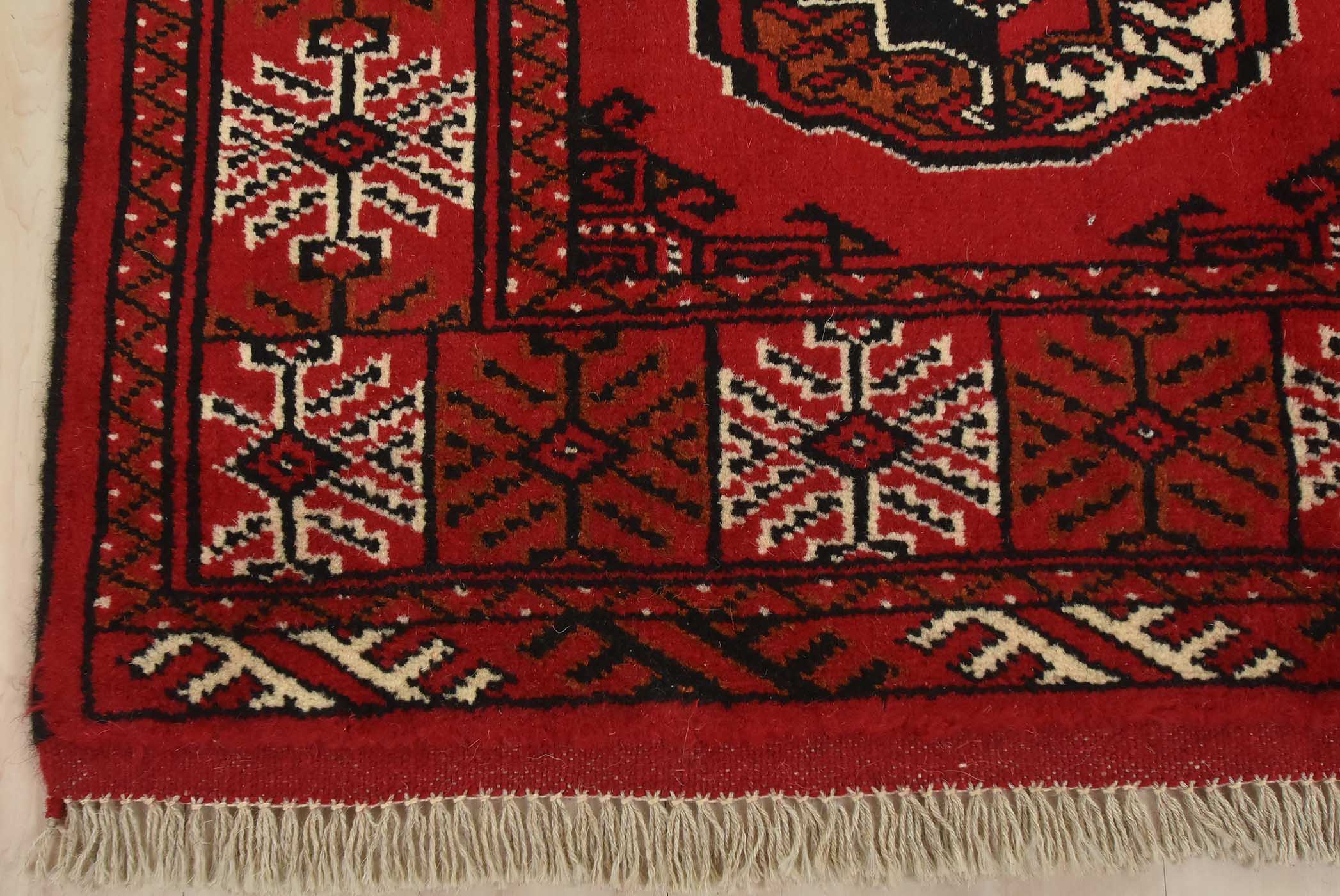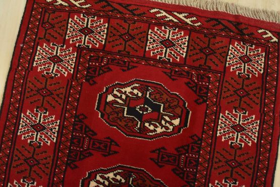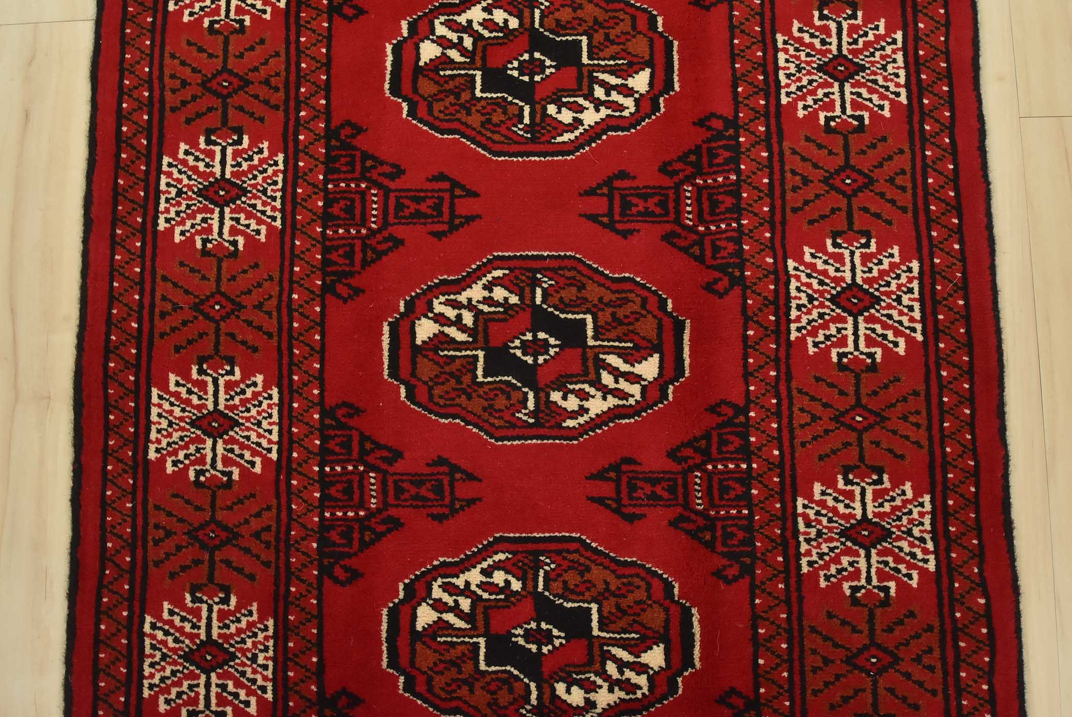 An authentic, vintage tribal Turkmen runner, hand-knotted with fine wool and natural dyes. This nomadic oriental rug features a row of repeating medallions set against a red background. It has a full wool pile with no worn areas and is in very good condition.