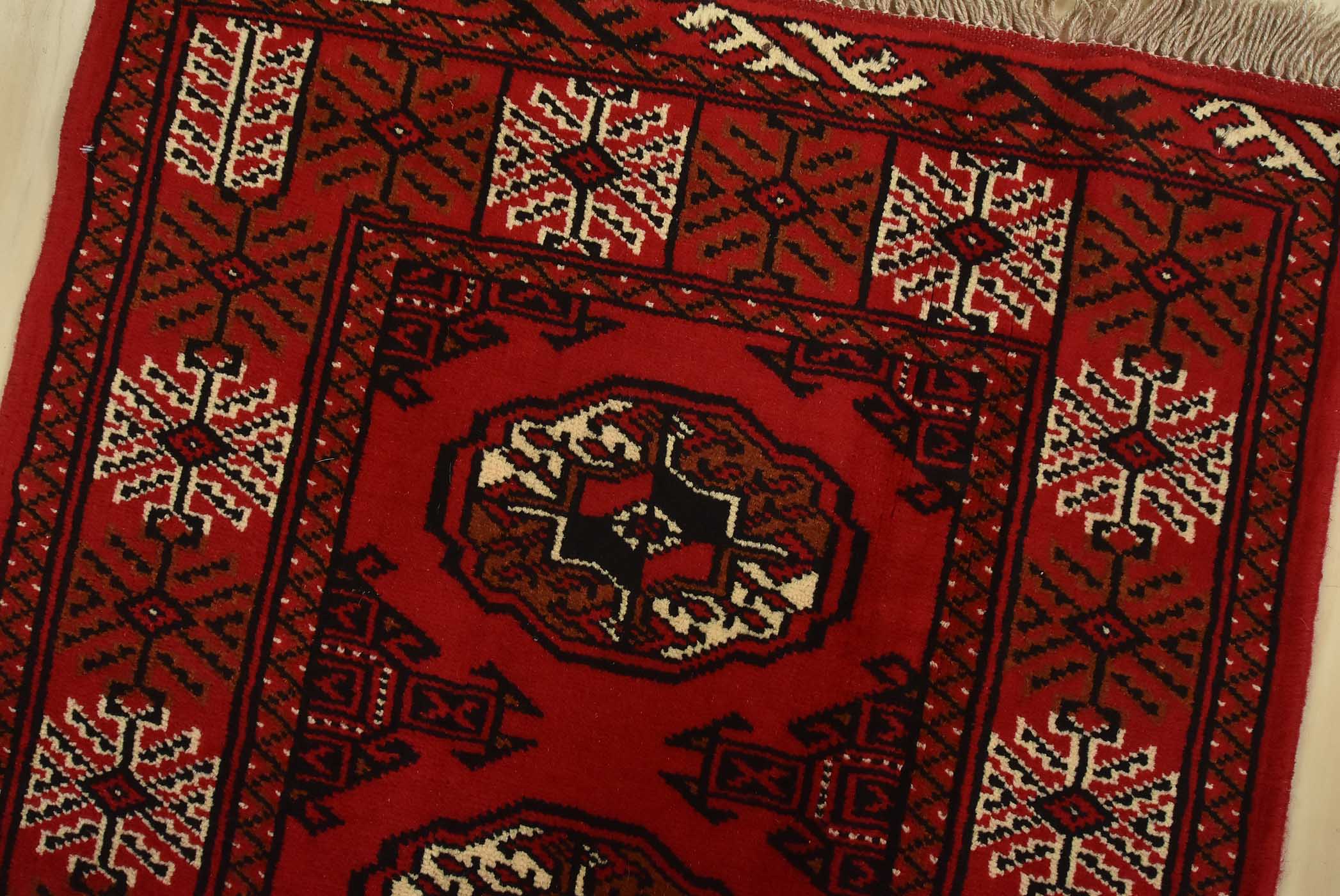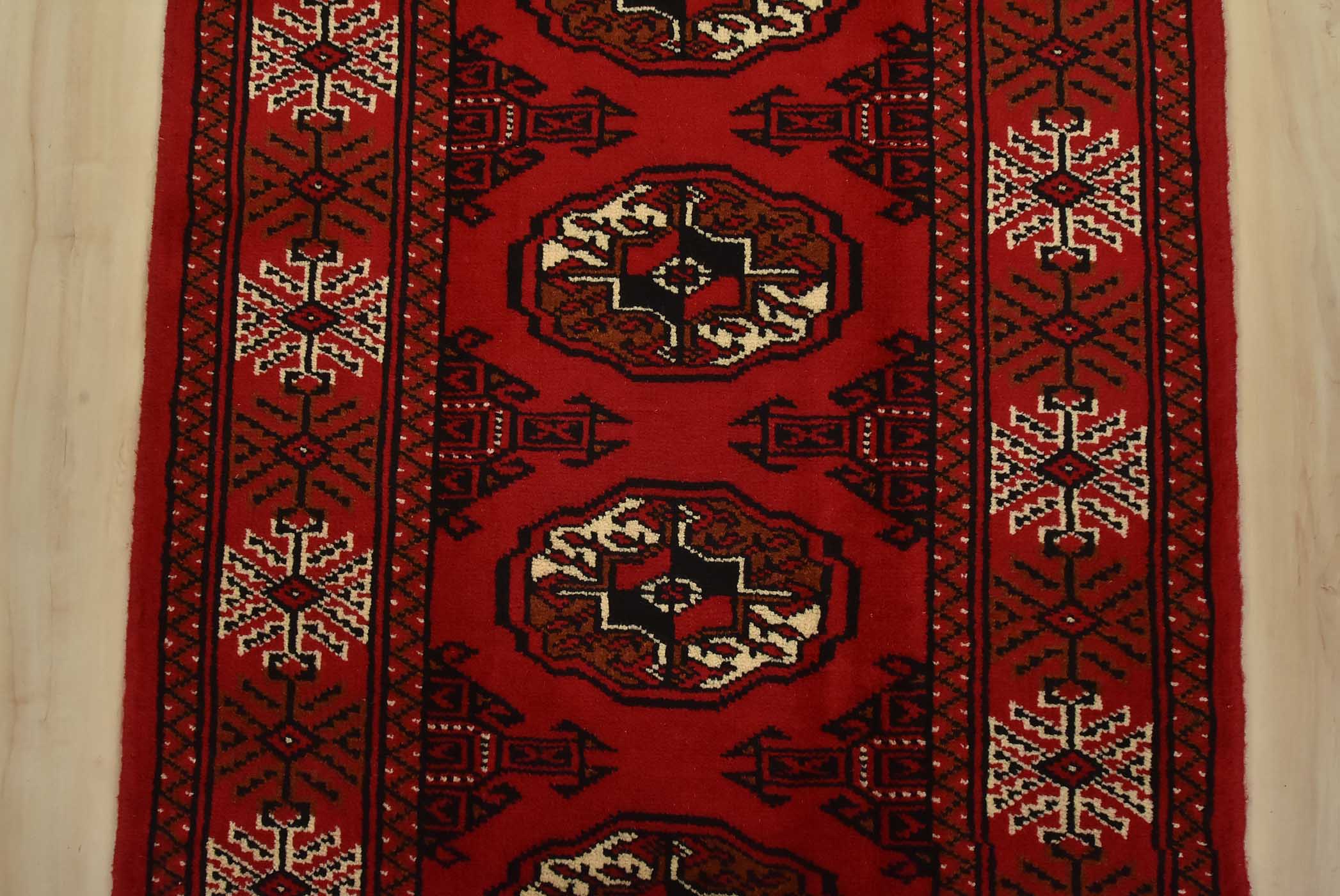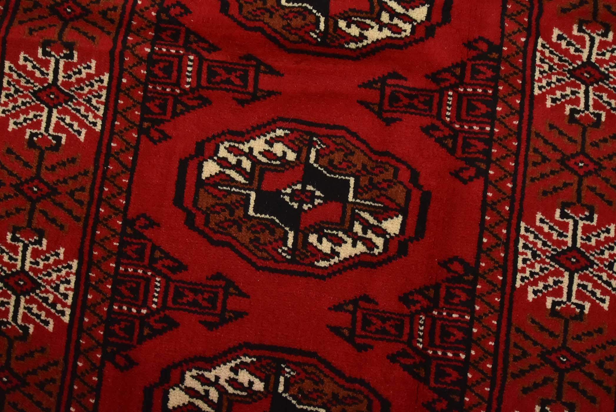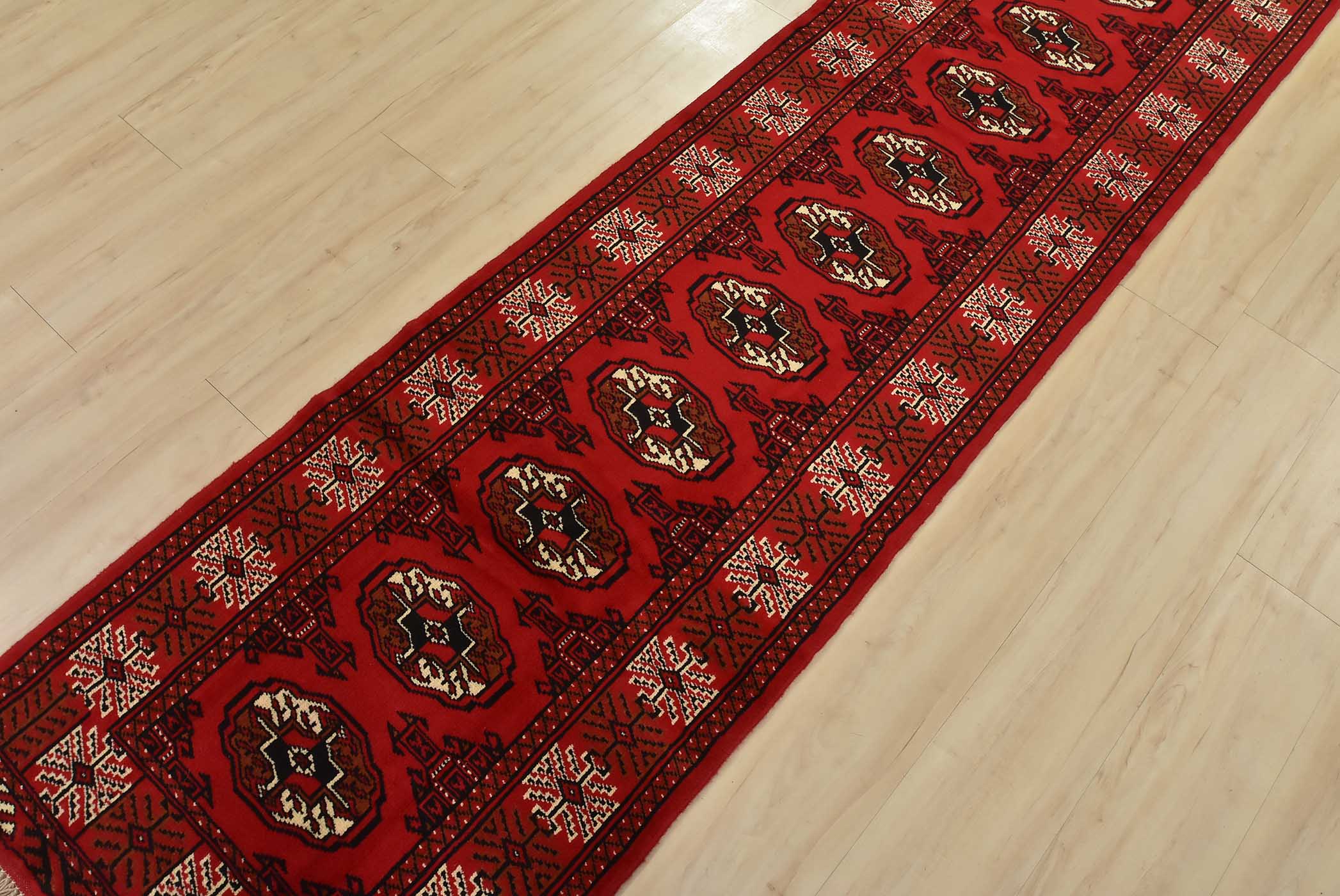 An authentic vintage tribal Turkmen runner, hand-knotted with fine wool and natural dyes. This nomadic rug features a row of geometric medallions set against a red background. It has a full wool pile with no worn areas and is in very good condition.