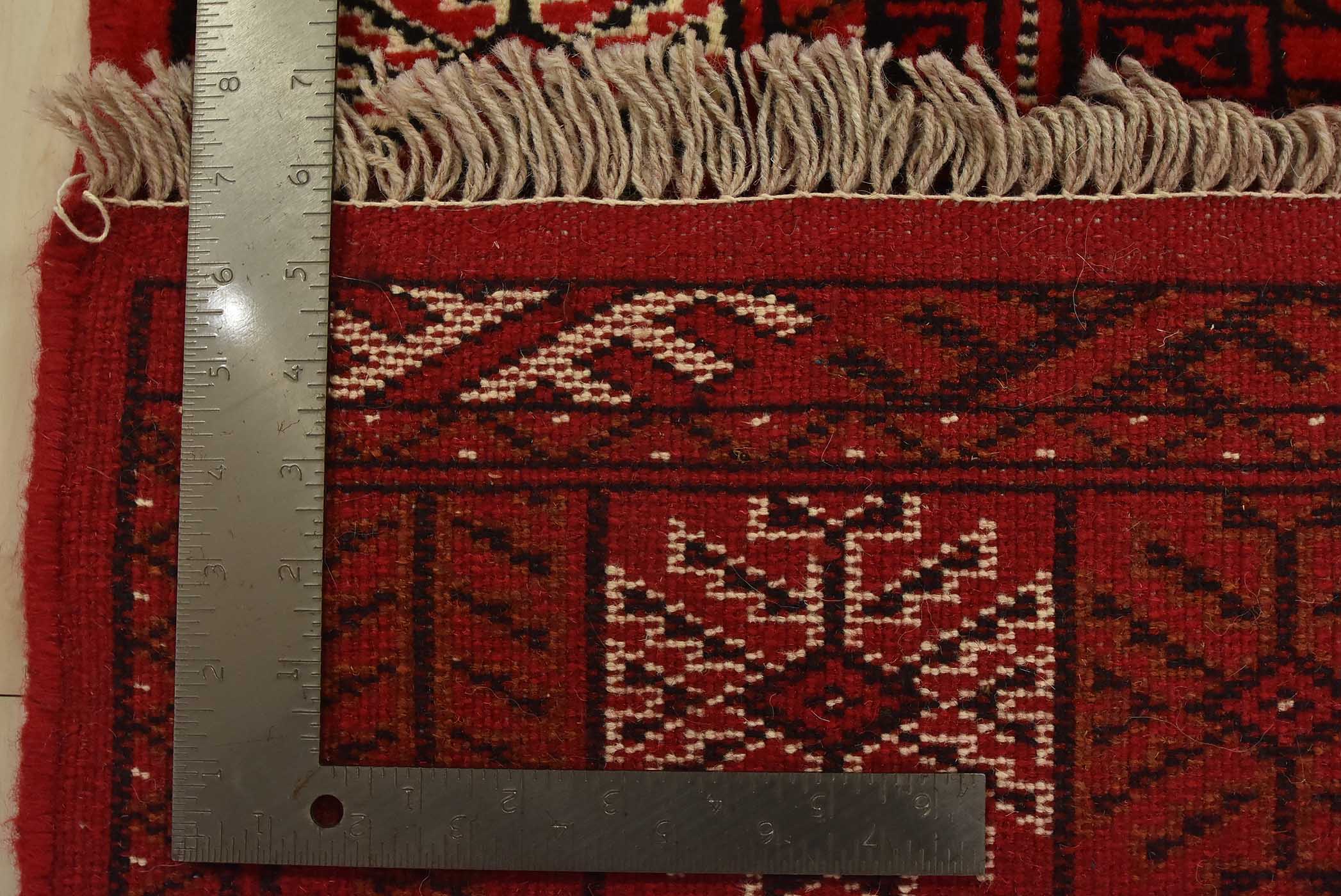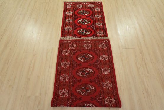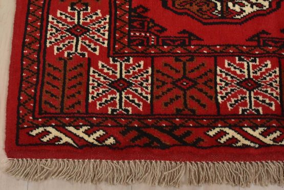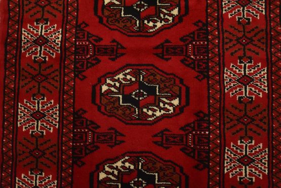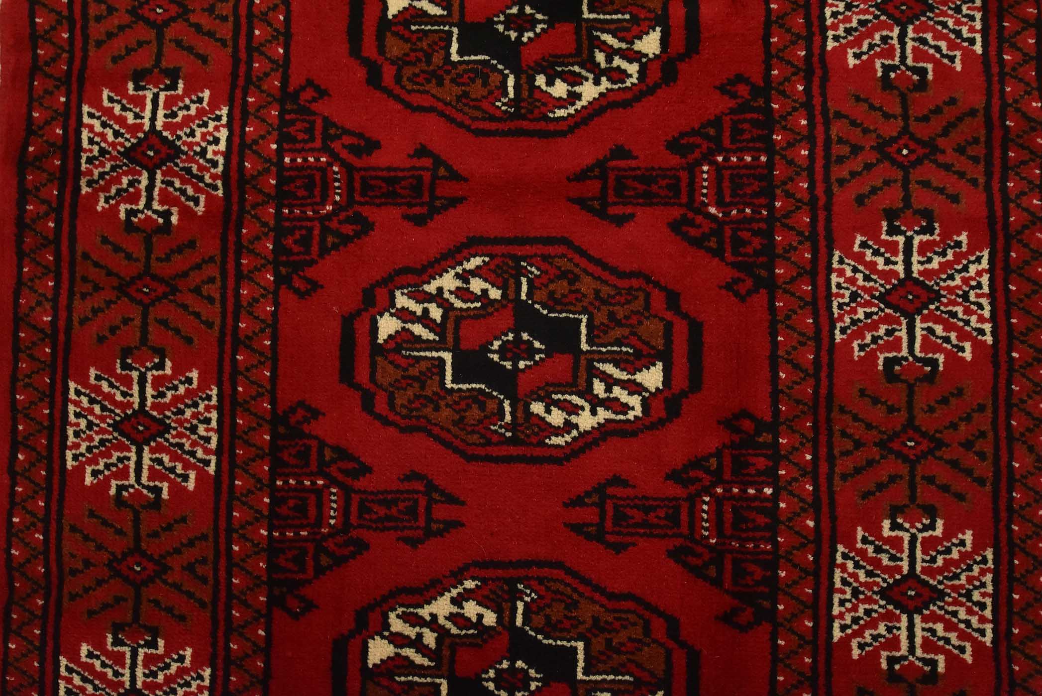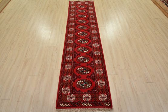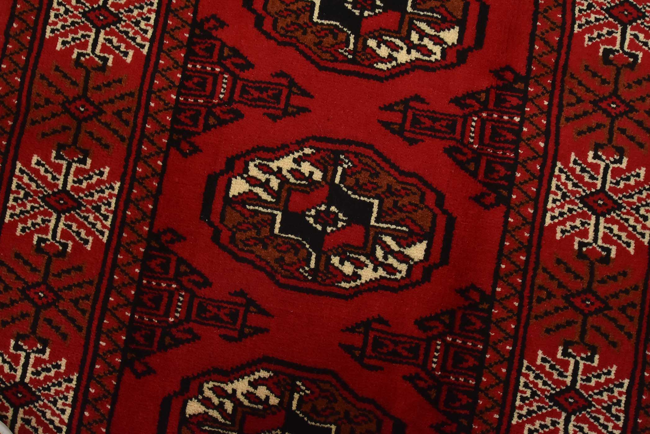 An authentic vintage tribal Turkmen runner, hand-knotted with fine wool and natural dyes. This nomadic rug features a row of geometric medallions set against a red background. It has a full wool pile with no worn areas and is in very good condition.