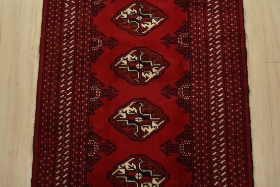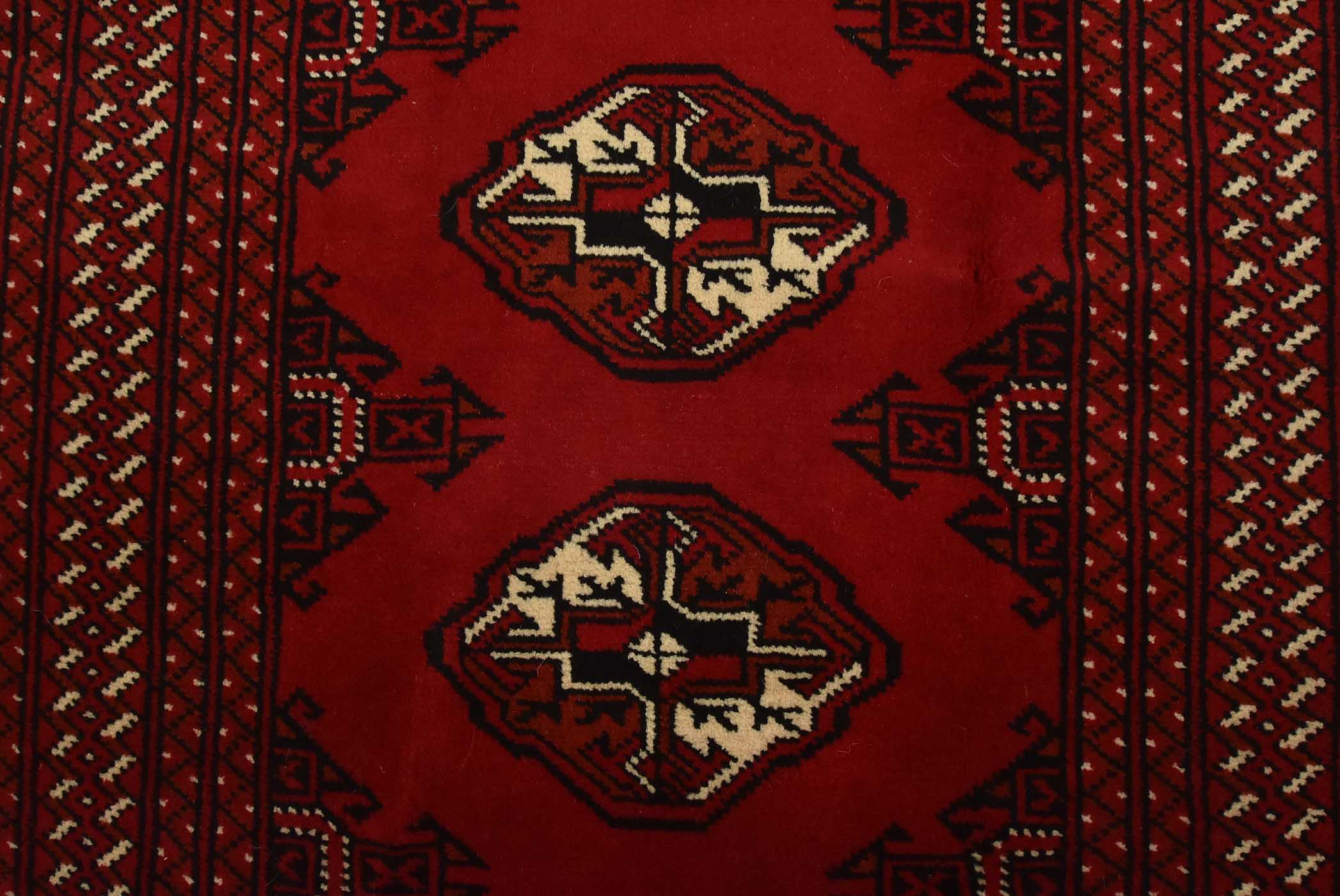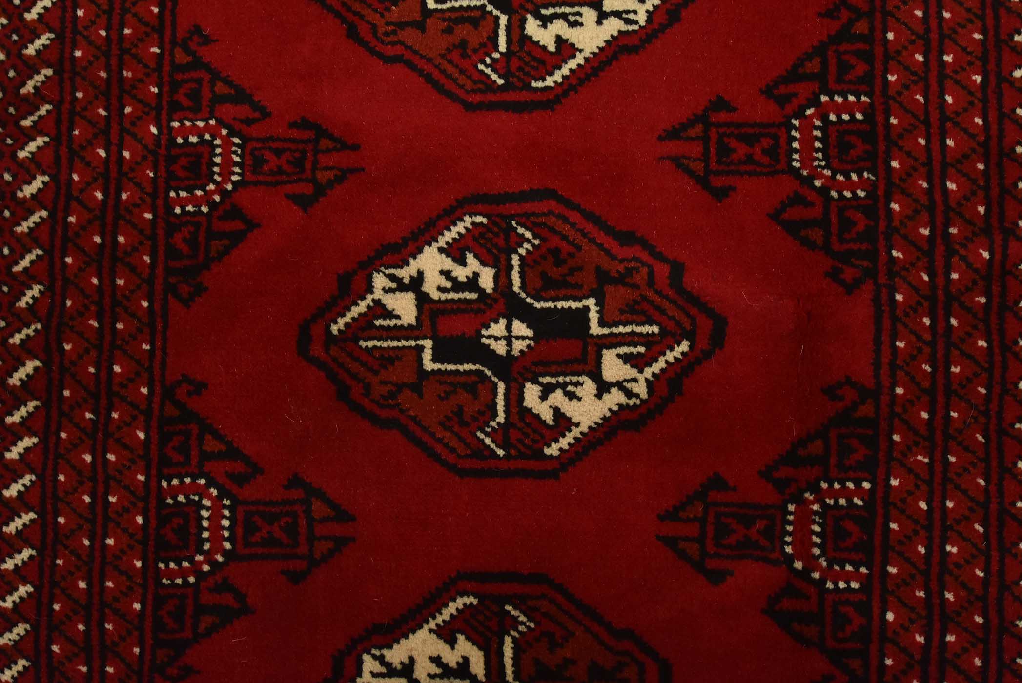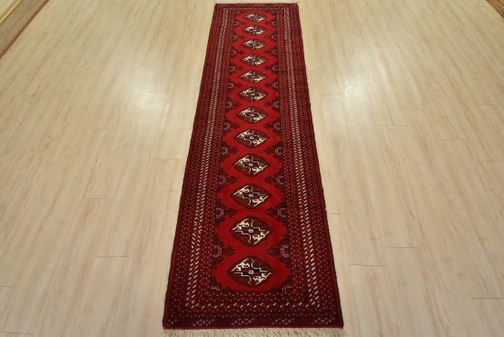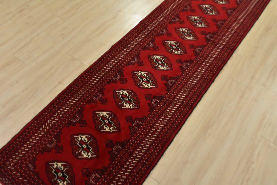 An authentic vintage tribal Turkmen runner, hand-knotted with fine wool and natural dyes. This nomadic rug features a row of geometric medallions set against a red background. It has a full wool pile with no worn areas and is in very good condition.