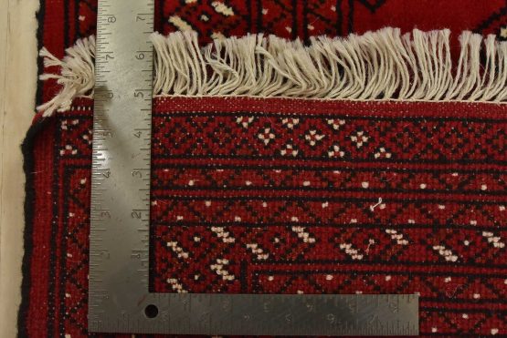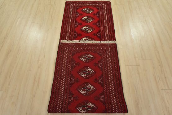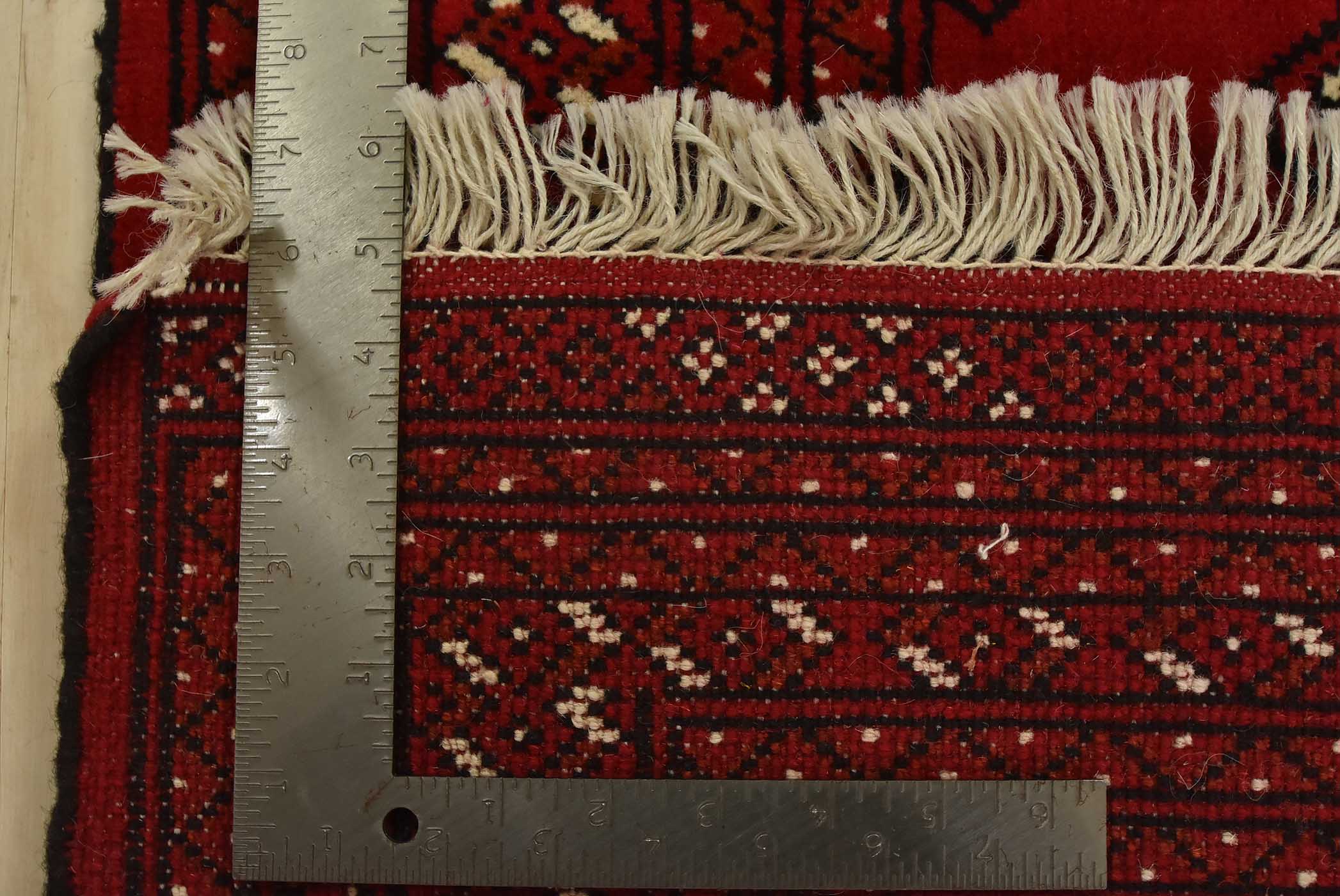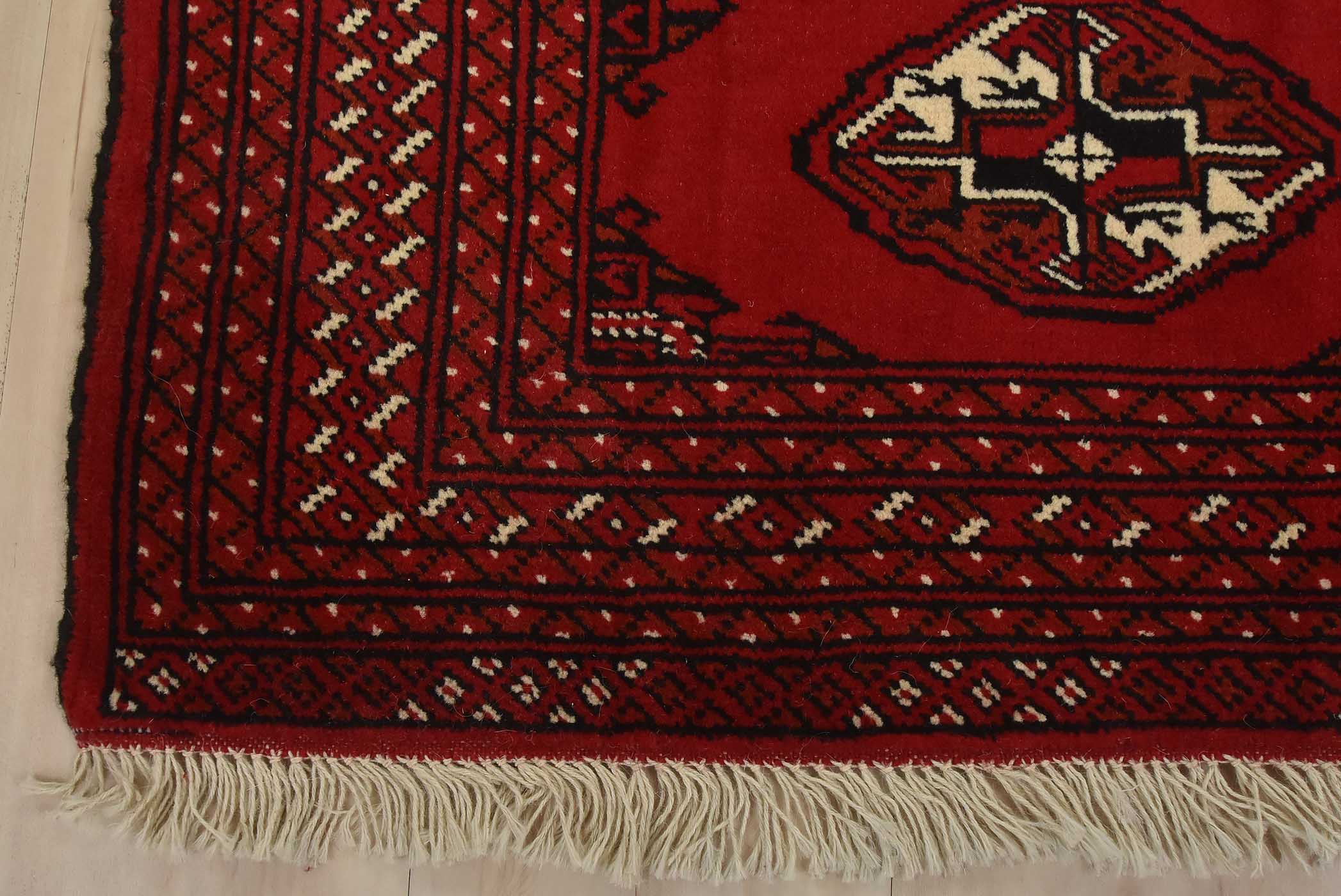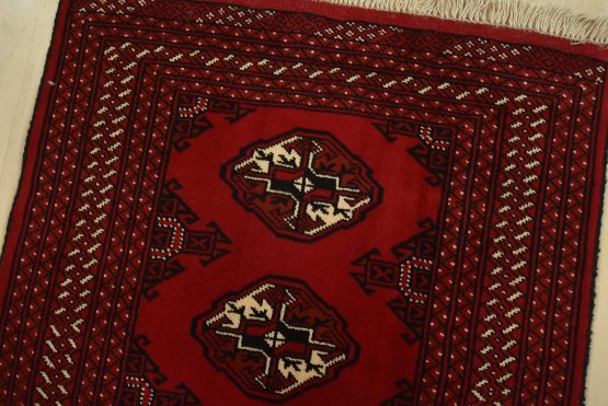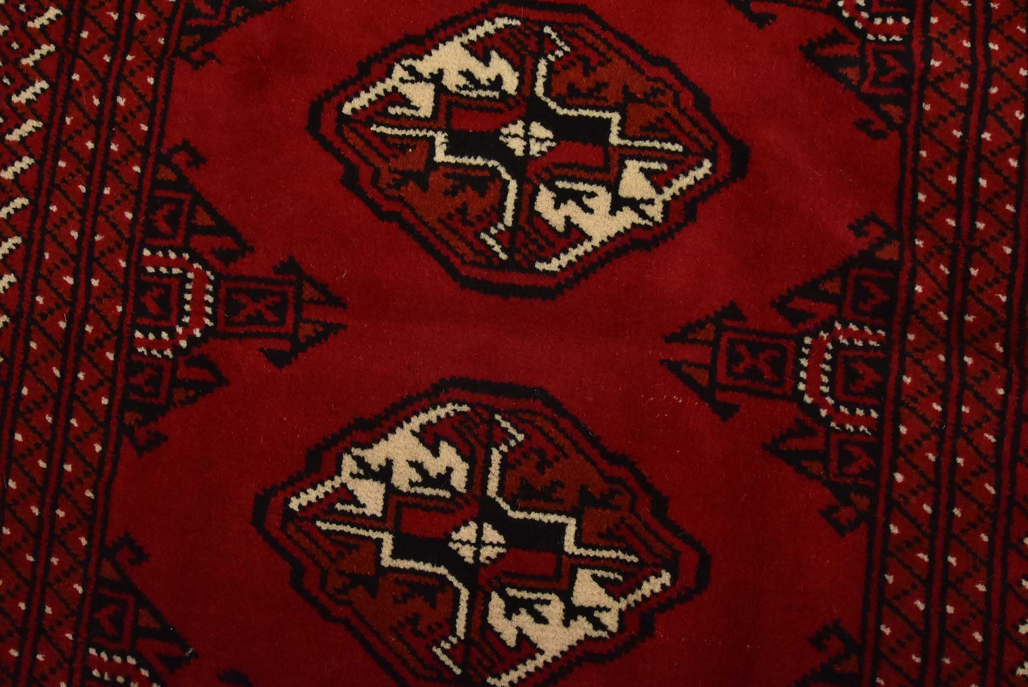 An authentic vintage tribal Turkmen runner, hand-knotted with fine wool and natural dyes. This nomadic rug features a row of geometric medallions set against a red background. It has a full wool pile with no worn areas and is in very good condition.