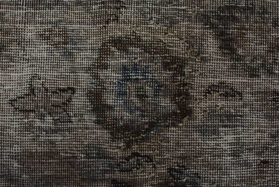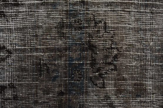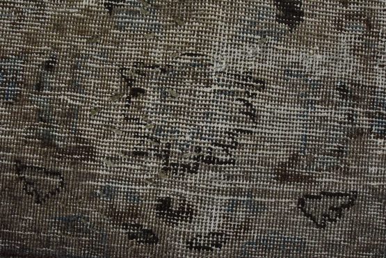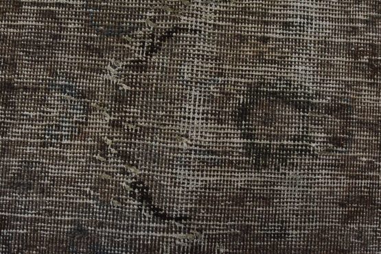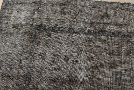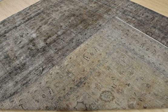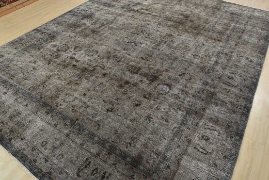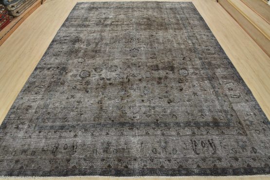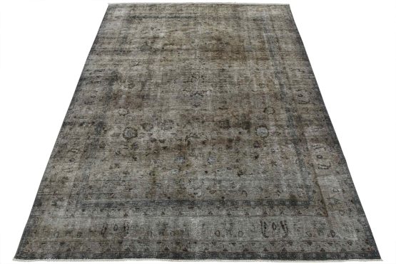 An authentic vintage traditional Overdyed Tabriz rug hand-knotted with an all-wool pile on a cotton foundation. This oriental rug features an all-over floral design set against a gray background. It has a low wool pile, is worn and distressed, and has minor imperfections (see photos). However, it is in very good condition.
