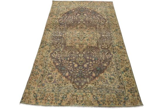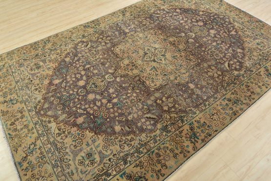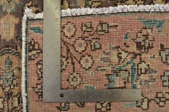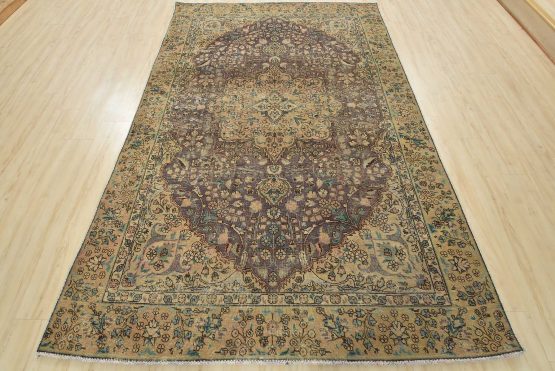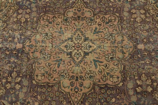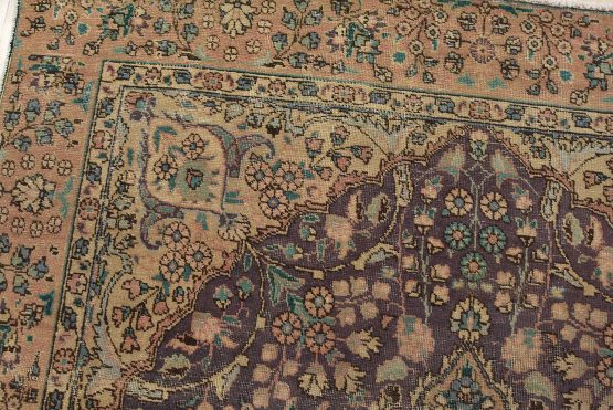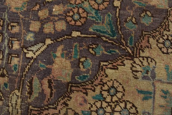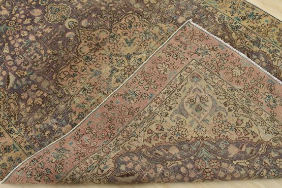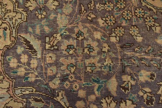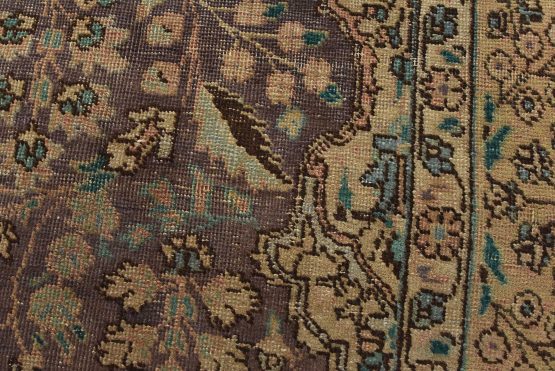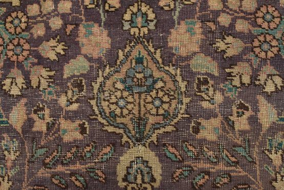 An authentic vintage traditional Tabriz rug hand-knotted with fine wool and natural dyes. This oriental rug features a central curvilinear medallion surrounded by botanical designs set against a purple background. It has a low wool pile, is worn and distressed, and has minor imperfections (see photos). However, it is in very good condition.