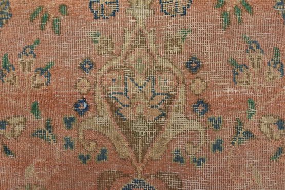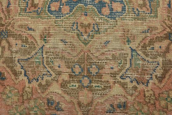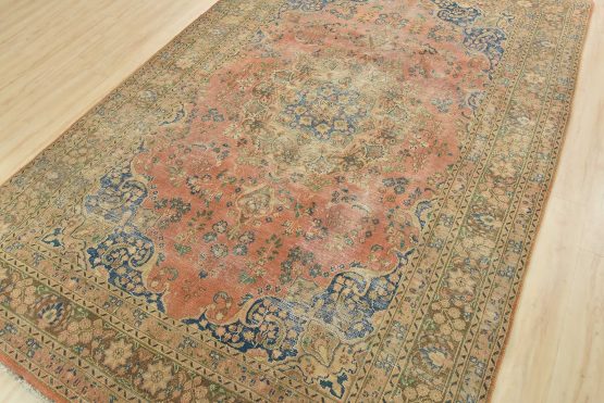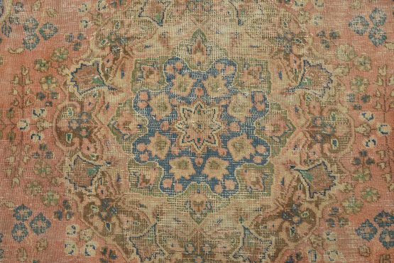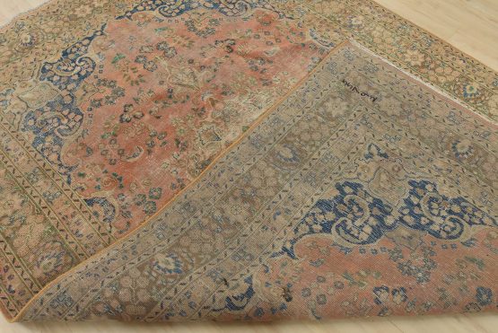 An authentic vintage traditional Tabriz rug hand-knotted with fine wool and natural dyes. This oriental rug features muted colors with a central medallion surrounded by floral designs set against a pink background. It has a low wool pile, is worn and distressed, and has minor imperfections (see photos). However, it is in very good condition.