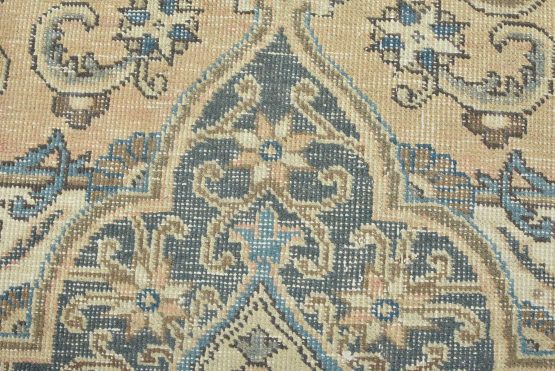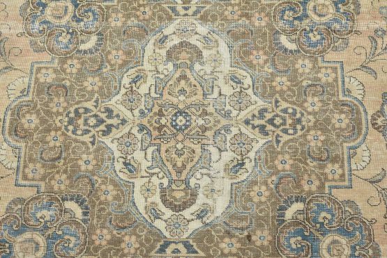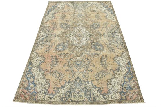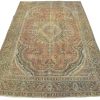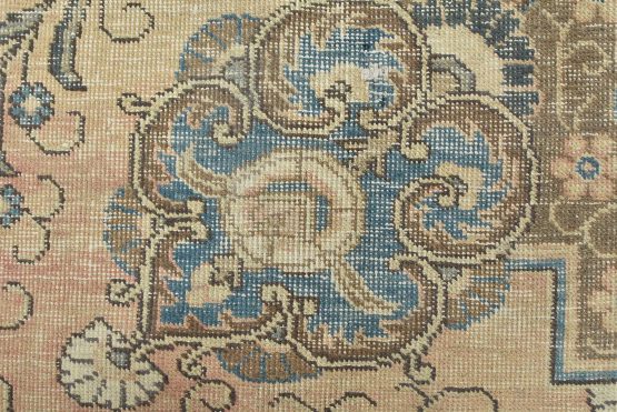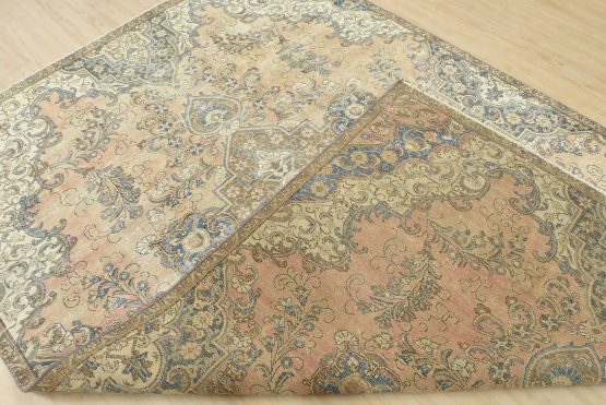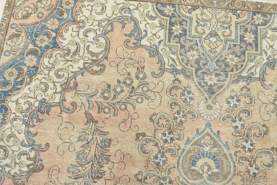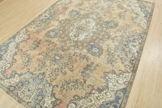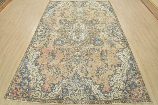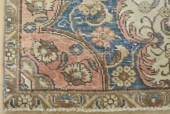 An authentic vintage traditional Tabriz rug hand-knotted with fine wool and natural dyes. This oriental rug features muted colors with a central medallion surrounded by botanical designs set against a pink background. It has a low wool pile, is worn and distressed, and has minor imperfections (see photos). However, it is in very good condition.