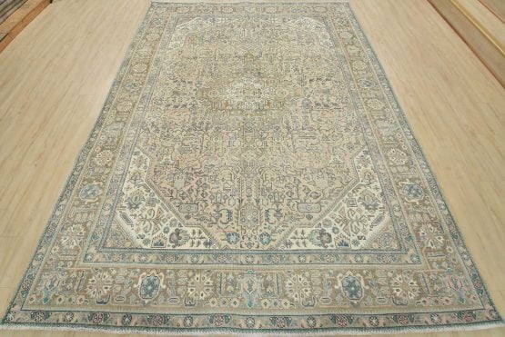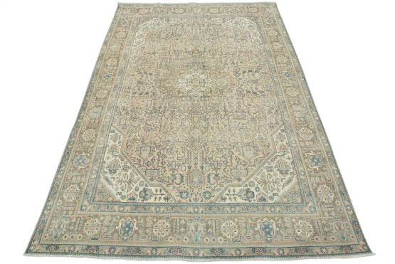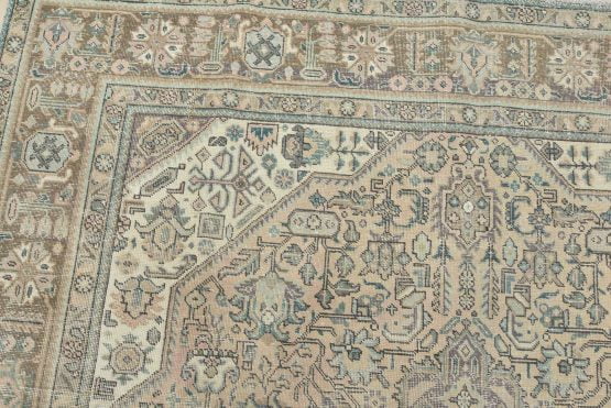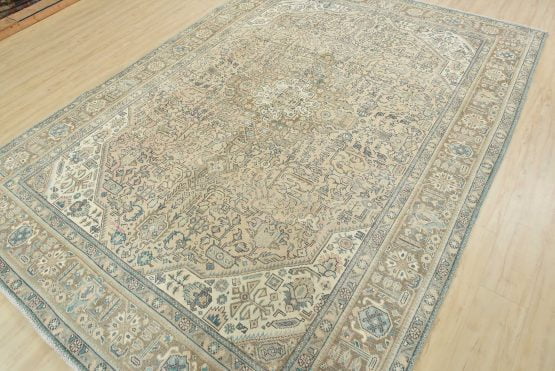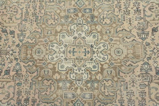An authentic vintage traditional Tabriz rug hand-knotted with an all-wool pile on a cotton foundation. This oriental rug features a central medallion surrounded by floral and botanical designs set against a pink background. It has a low wool pile, is worn and distressed, and has minor imperfections (see photos). However, it is in very good condition.