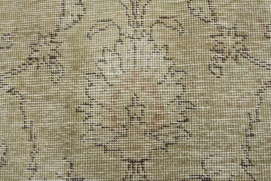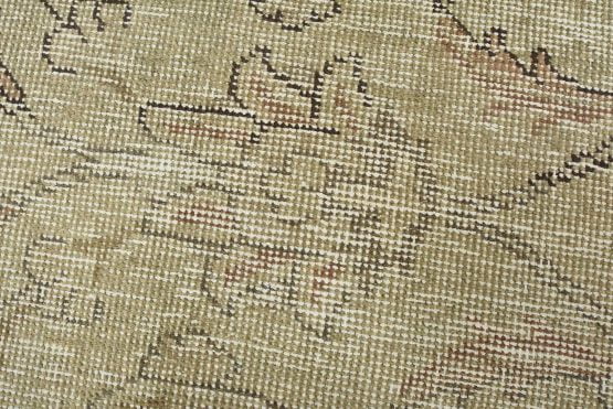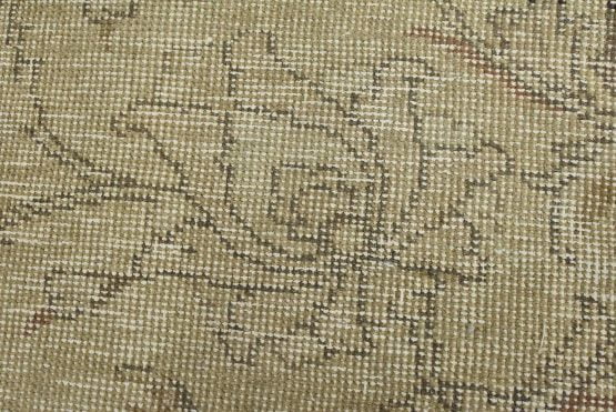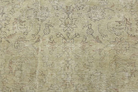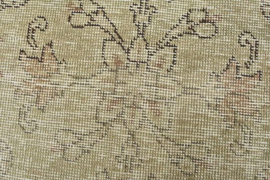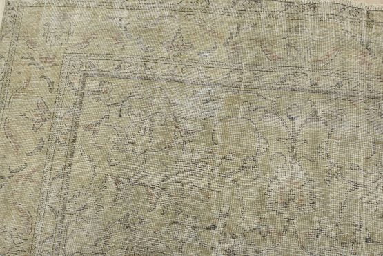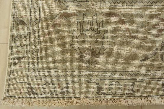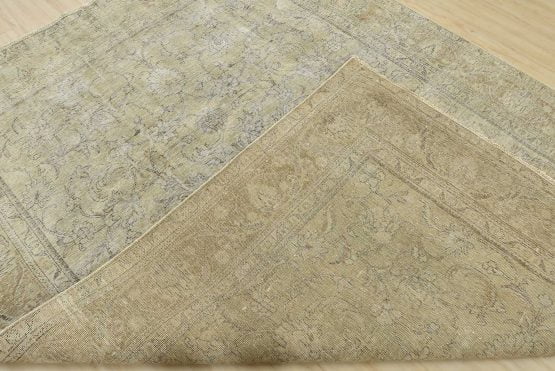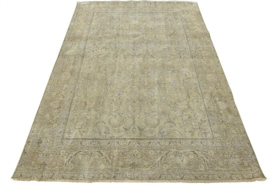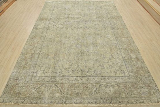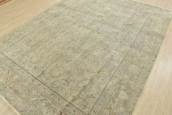 An authentic vintage traditional Tabriz rug hand-knotted with an all-wool pile on a cotton foundation. This rug features an all-over muted floral design set against a beige background. It has a low wool pile, is worn and distressed, and has minor imperfections (see photos). However, it is in very good condition.
