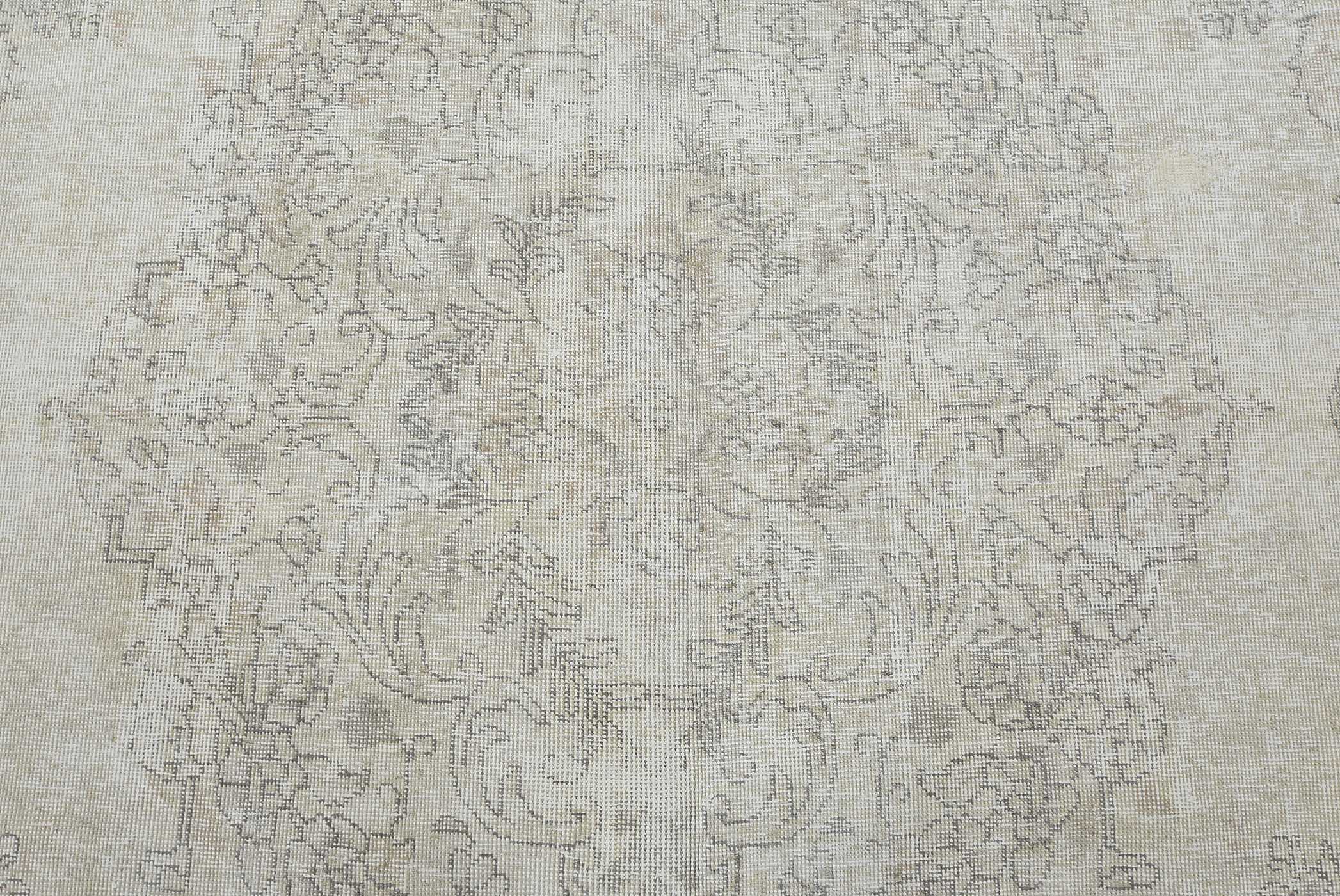 An authentic vintage traditional Tabriz rug hand-knotted with an all-wool pile on a cotton foundation. This oriental rug features a muted central curvilinear medallion surrounded by muted floral motifs set against a beige background. It has a low wool pile, is worn and distressed, and has minor imperfections (see photos). However, it is in very good condition.