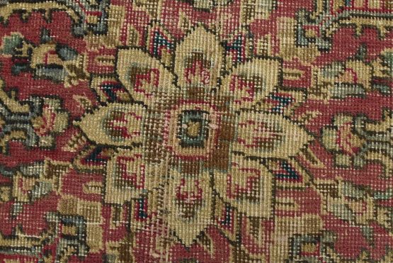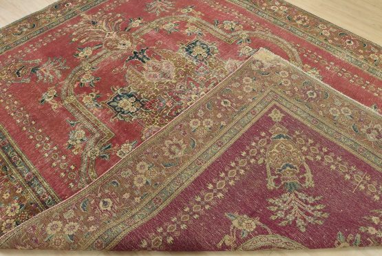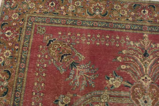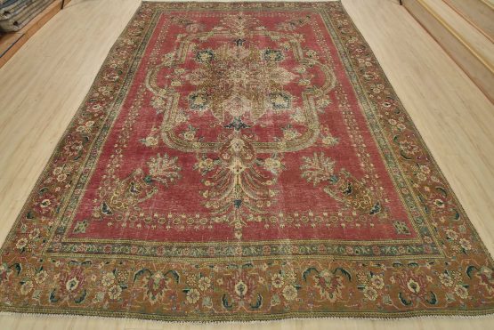An authentic vintage traditional Tabriz rug hand-knotted with an all-wool pile on a cotton foundation. This oriental rug features a central medallion surrounded by floral motifs set against a red background. It has a low wool pile, is worn and distressed, and has minor imperfections (see photos). However, it is in very good condition.