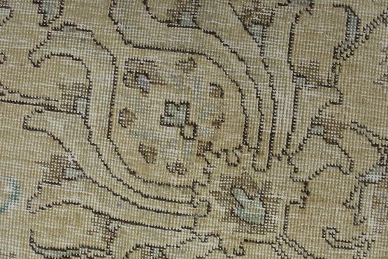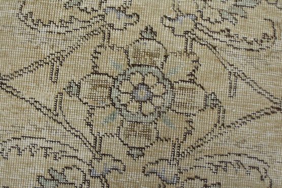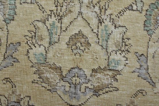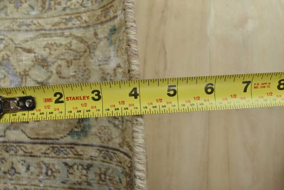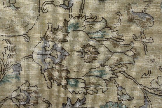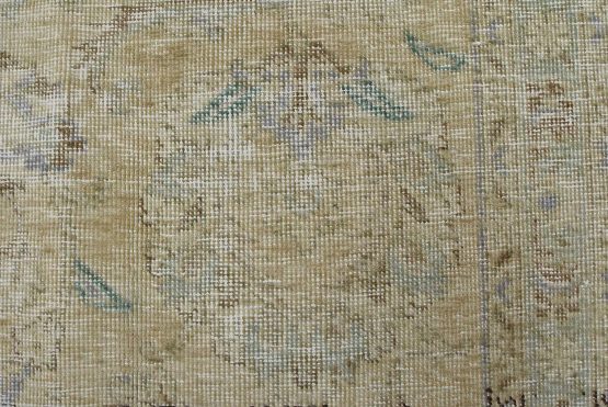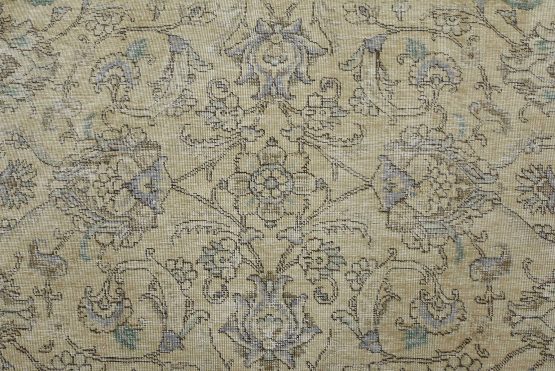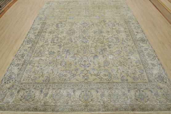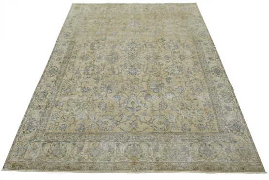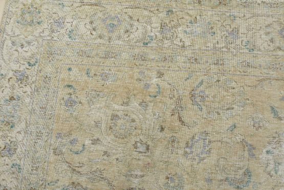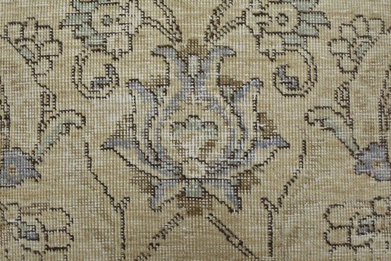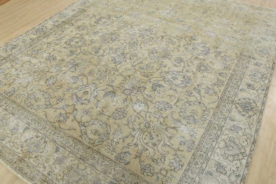 An authentic vintage traditional Tabriz rug hand-knotted with an all-wool pile on a cotton foundation. This oriental rug features muted colors with an all-over floral design set against a beige background. It has a low wool pile, is worn and distressed, with threadbare areas and minor imperfections (see photos). However, it is in very good condition.