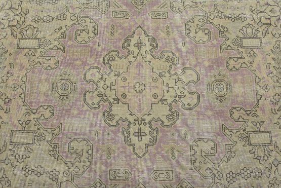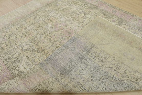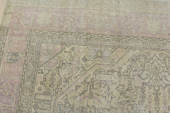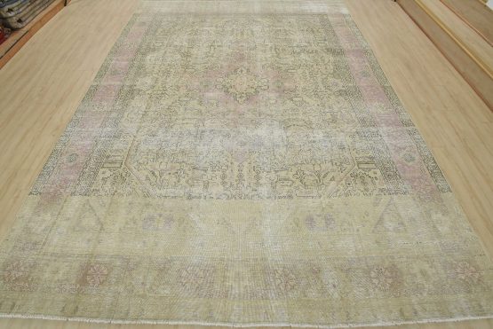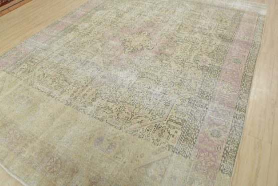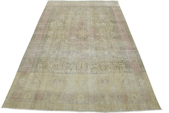 An authentic vintage traditional Tabriz rug hand-knotted with an all-wool pile on a cotton foundation. This oriental rug features muted colors with a central medallion surrounded by floral and geometric motifs set against a beige background. It has a low wool pile, is worn and distressed, and has minor imperfections (see photos). However, it is in very good condition.
