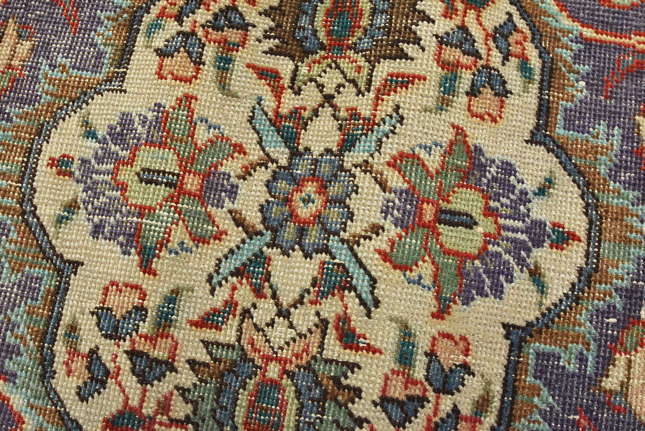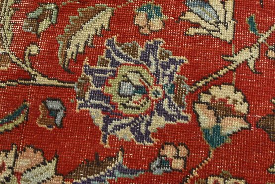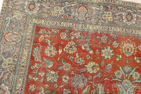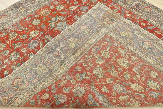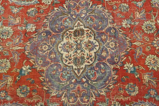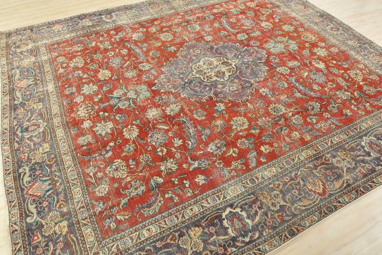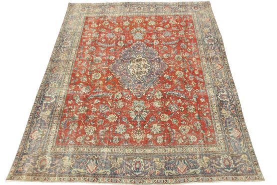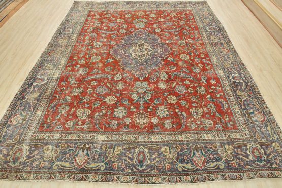 An authentic vintage traditional Tabriz rug hand-knotted with fine wool and natural dyes. This oriental rug features a central curvilinear medallion surrounded by a floral design set against a red background. It has a low wool pile, is worn and distressed, and has minor imperfections (see photos). However, it is in very good condition.