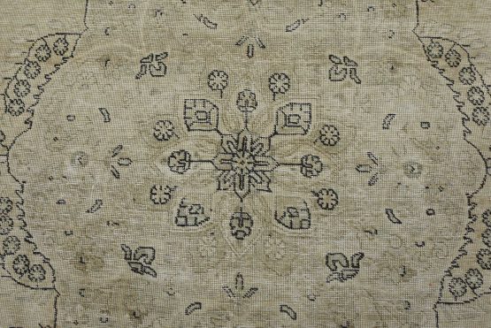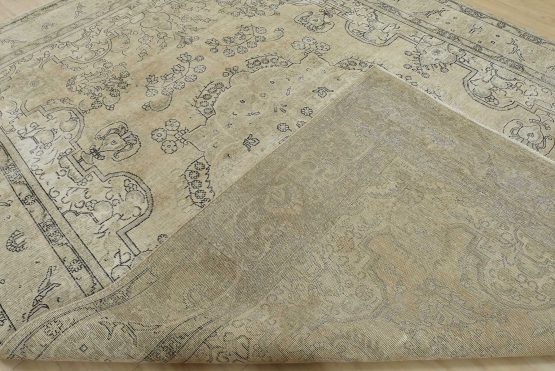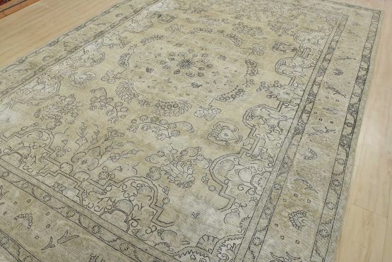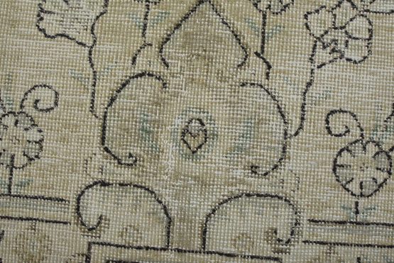An authentic vintage traditional Tabriz rug hand-knotted with an all-wool pile on a cotton foundation. This oriental rug features a central medallion surrounded by floral motifs set against a beige background. It has a low wool pile, is worn and distressed, and has minor imperfections (see photos). However, it is in very good condition.