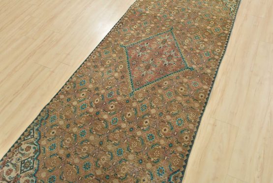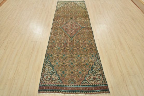 An authentic semi-antique tribal Hamedan runner hand-knotted with fine wool and natural dyes. This oriental rug features a central geometric diamond-shaped medallion surrounded by a Herati pattern set against a brown background. It has a low wool pile, is worn and distressed, and has minor imperfections (see photos). However, it is in very good condition.