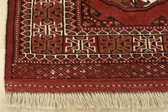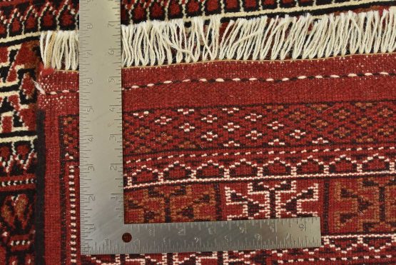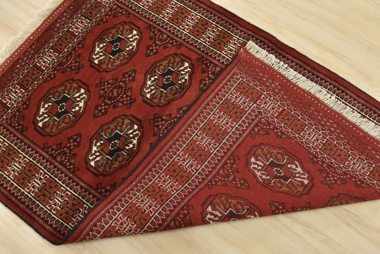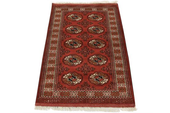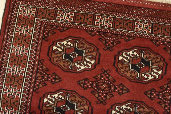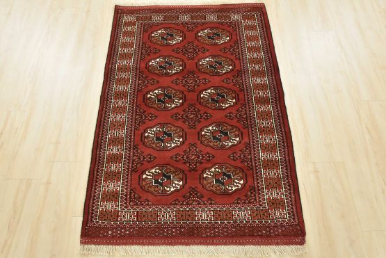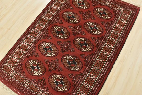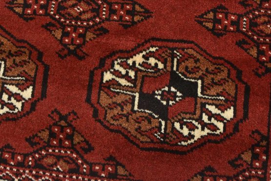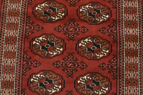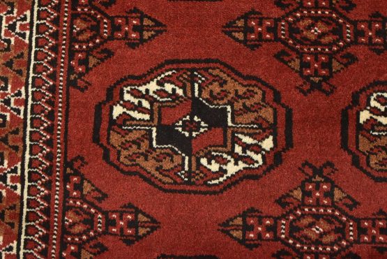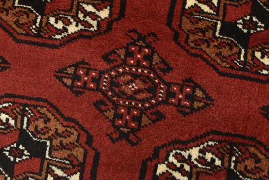 An authentic vintage tribal Turkmen rug hand-knotted with fine wool and natural dyes. This nomadic oriental rug features rows of repeating geometric medallions set against a red background. It has a full wool pile with no worn areas and is in very good condition.