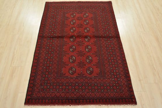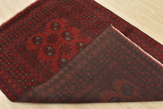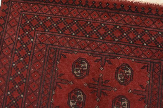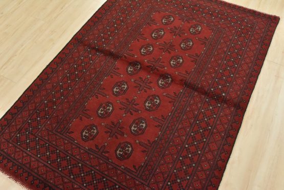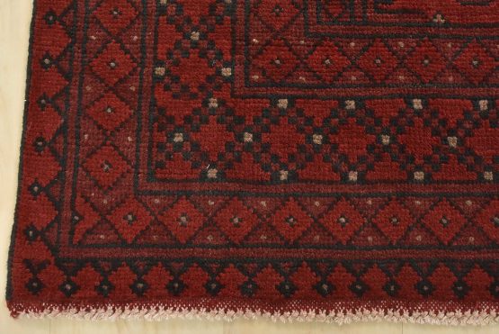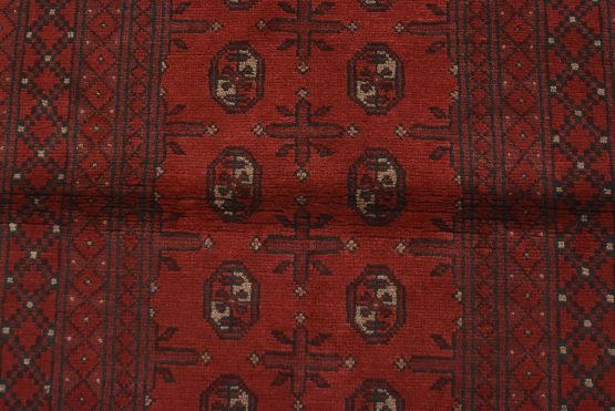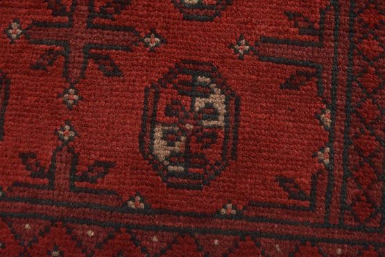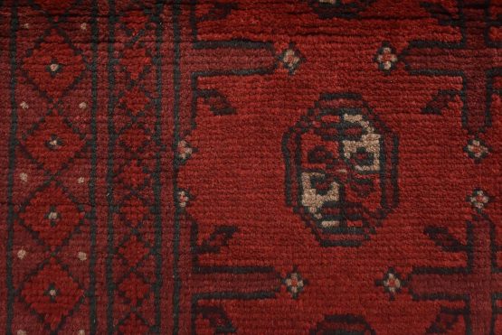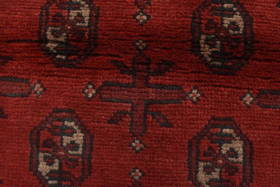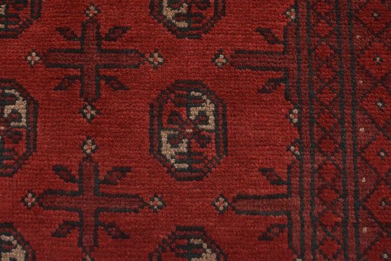 An authentic vintage tribal Turkmen rug hand-knotted with fine wool and natural dyes. This nomadic oriental rug features rows of repeating small geometric medallions set against a red background. It has a full wool pile with no worn areas and is in very good condition.