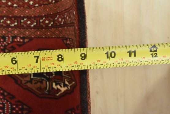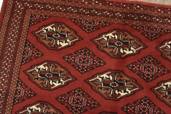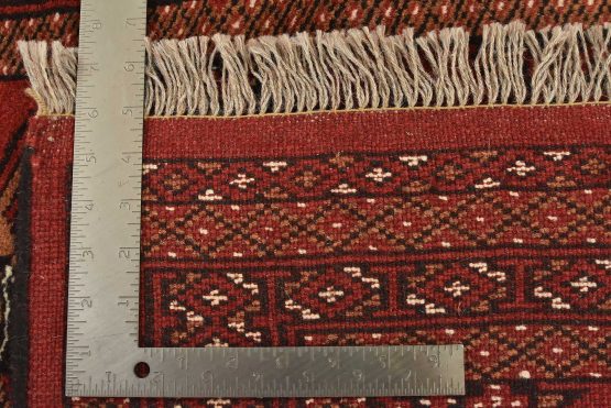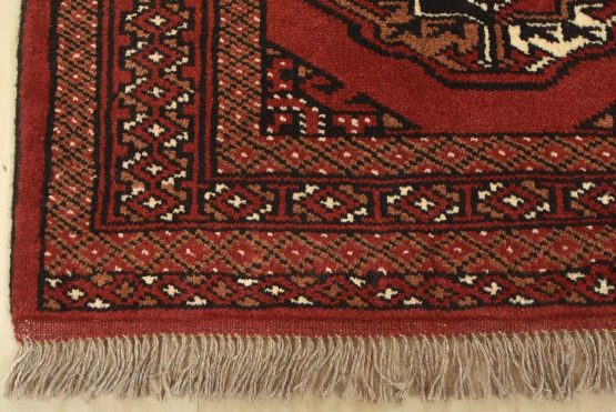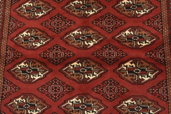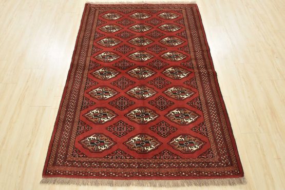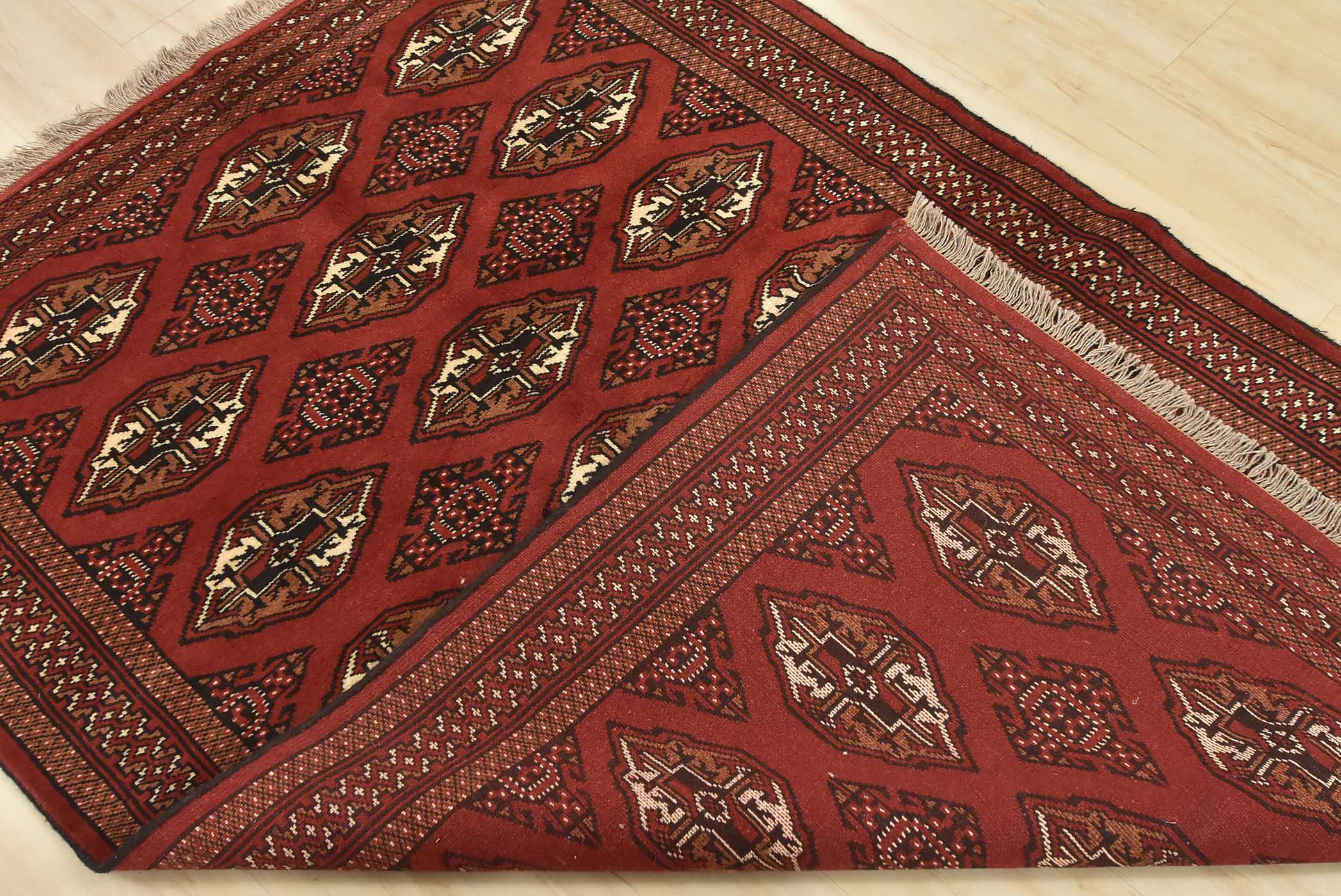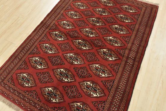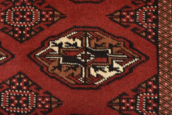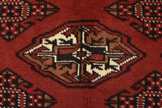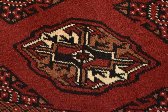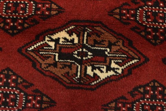 An authentic vintage tribal Turkmen rug hand-knotted with fine wool and natural dyes. This nomadic oriental rug features rows of repeating geometric medallions set against a red background. It has a full wool pile with no worn areas and is in very good condition.