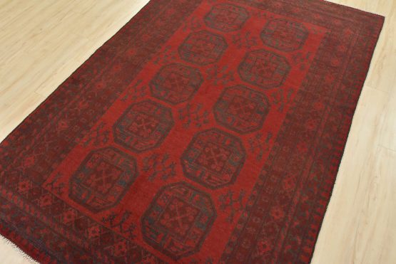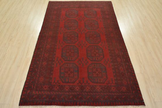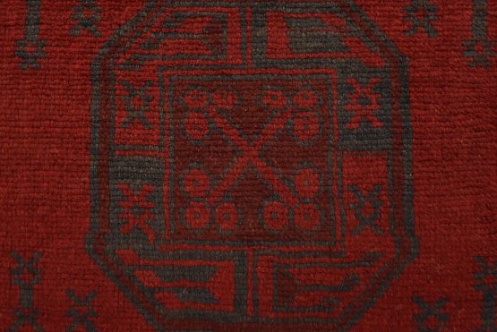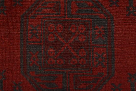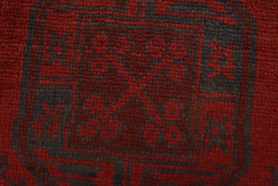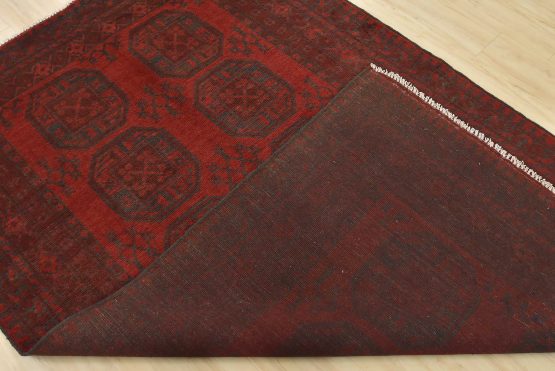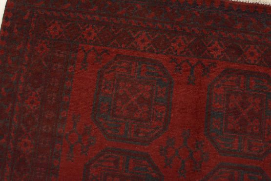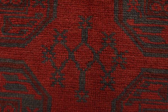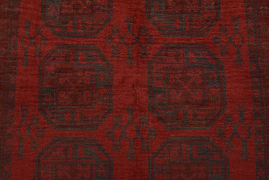 An authentic vintage tribal Turkmen rug hand-knotted with fine wool and natural dyes. This nomadic oriental rug features rows of geometric medallions surrounded by geometric motifs set against a red background. It has a full wool pile with no worn areas and is in very good condition.