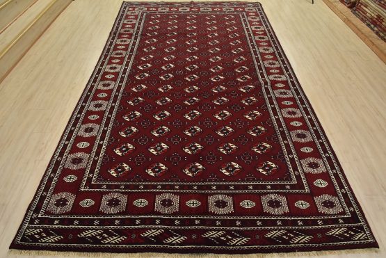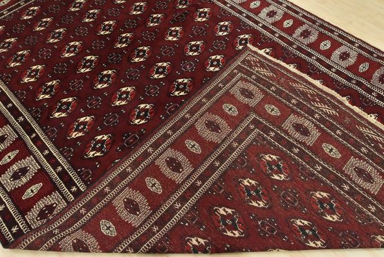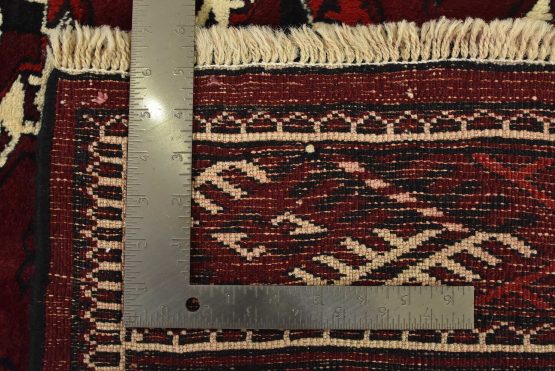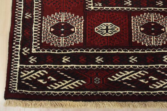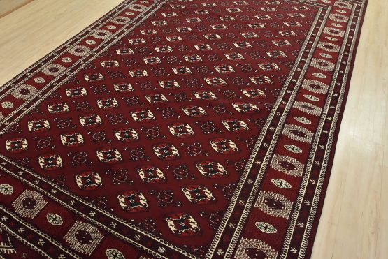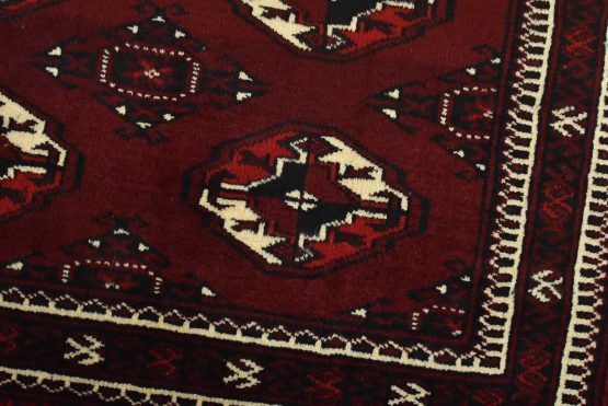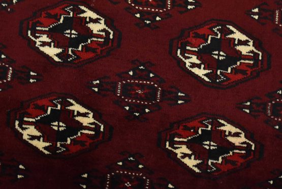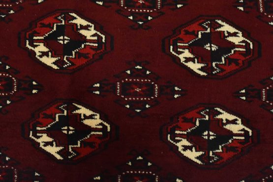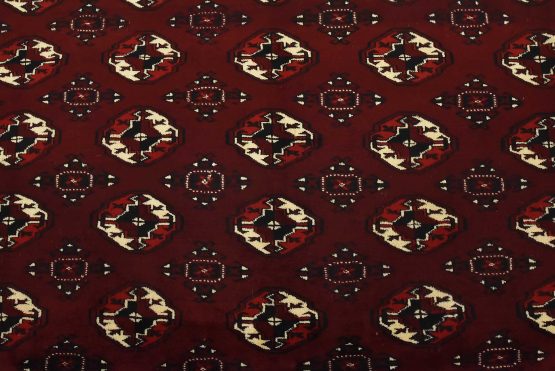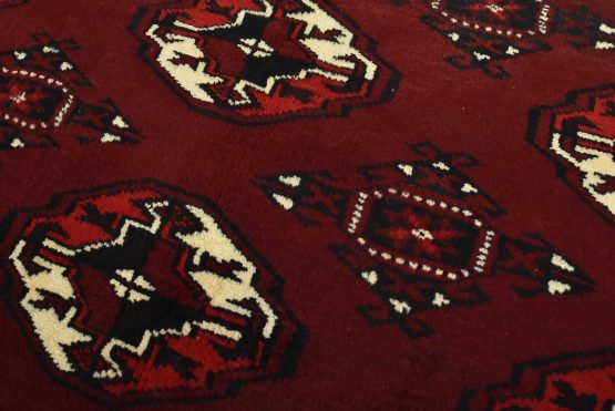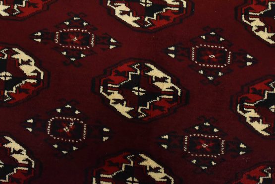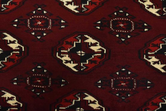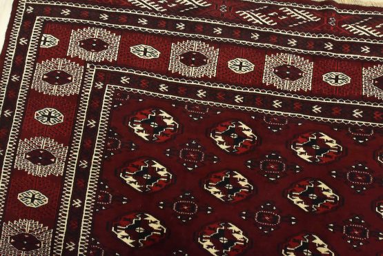 An authentic vintage tribal Turkmen rug hand-knotted with fine wool and natural dyes. This finely woven nomadic rug features repeating rows of geometric medallions set against a deep red background. It is in excellent shape for an older rug. It has a full wool pile with no worn areas and is in very good condition.