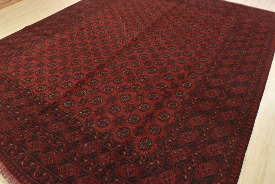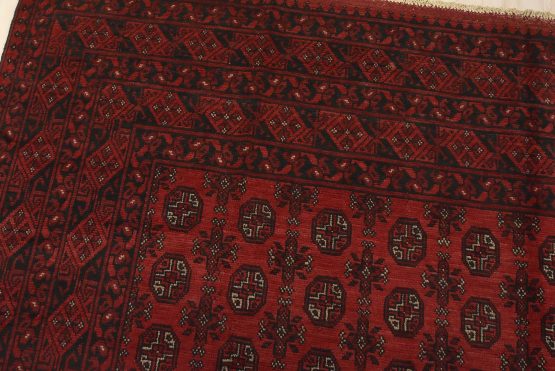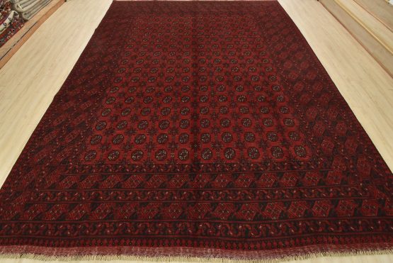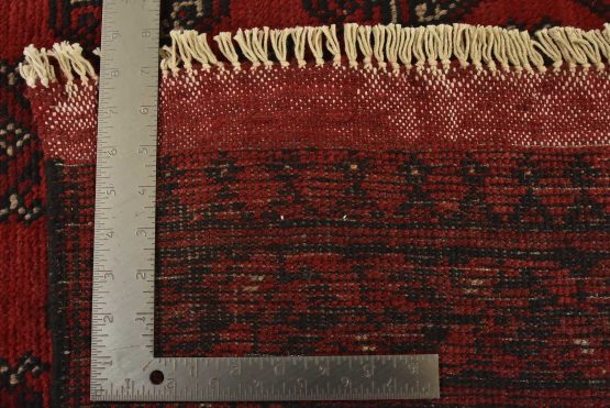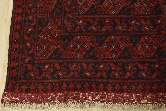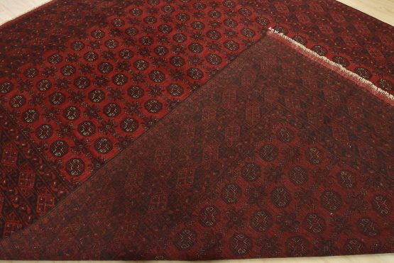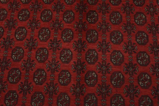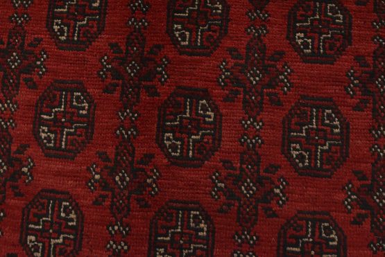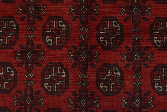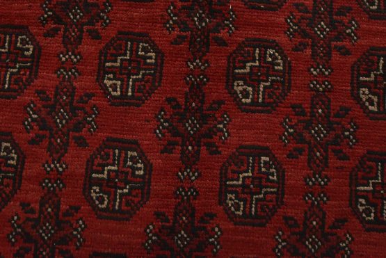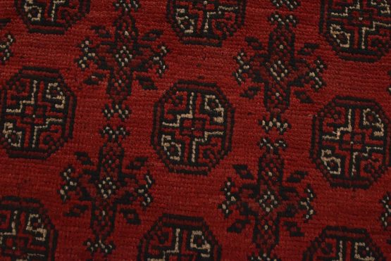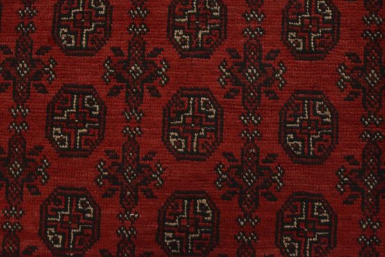 An authentic vintage tribal Turkmen rug hand-knotted with fine wool and natural dyes. This nomadic oriental rug features repeating rows of small-scale geometric medallions set against a red background. It has a full wool pile with no worn areas and is in very good condition.