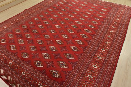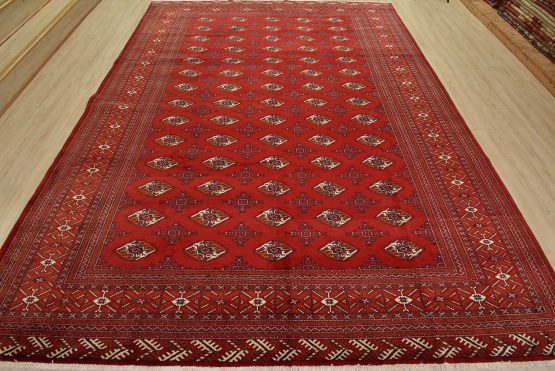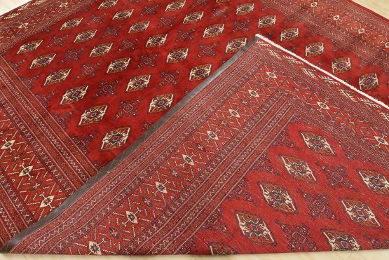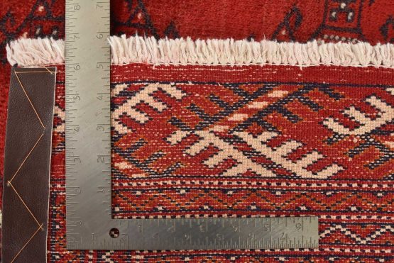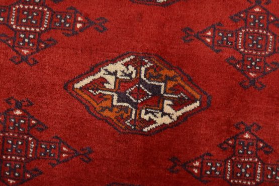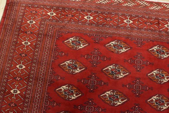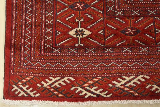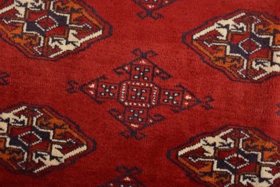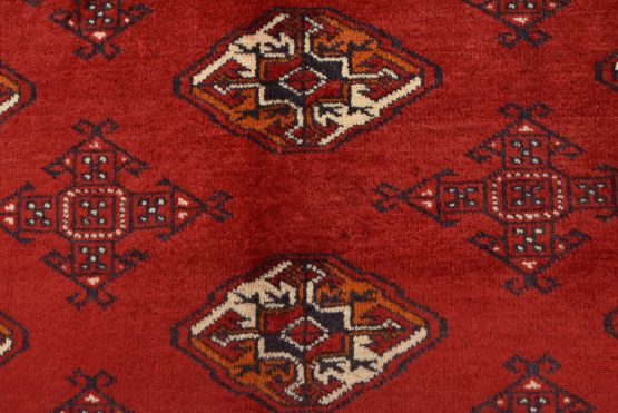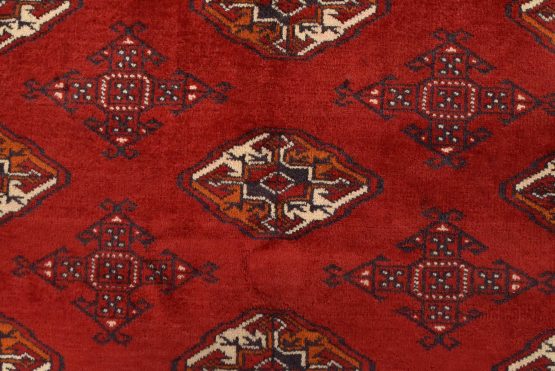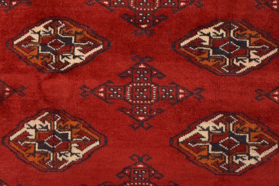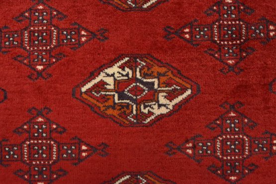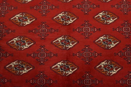 An authentic vintage tribal Turkmen rug hand-knotted with fine wool and natural dyes. This nomadic oriental rug features rows of repeating geometric medallions set against a red background. It has a full wool pile with no worn areas and is in very good condition.