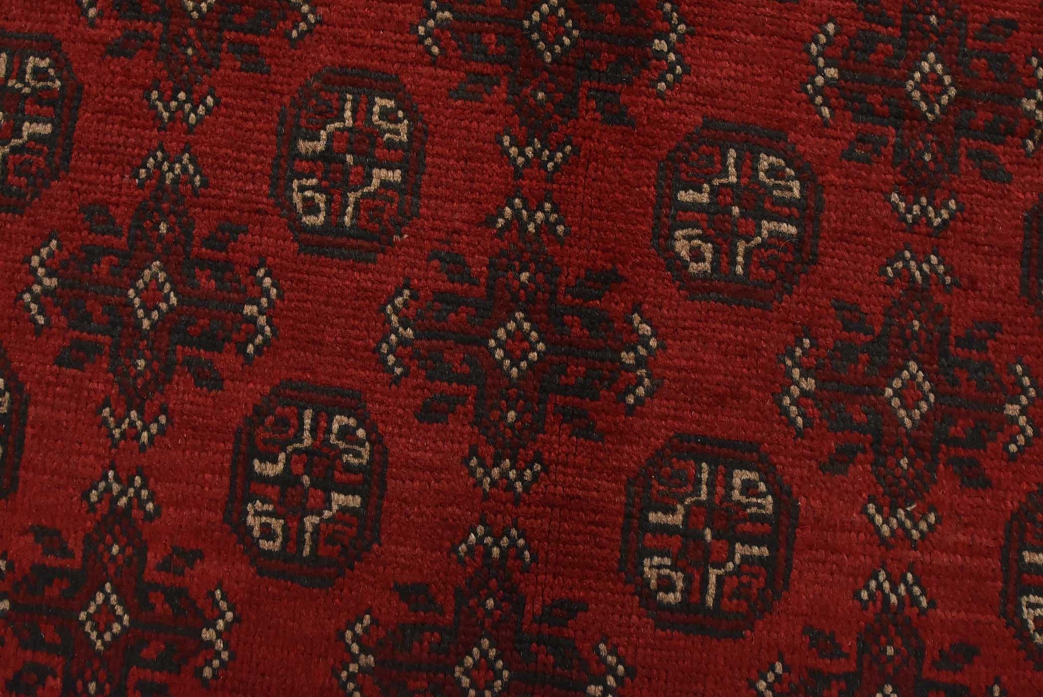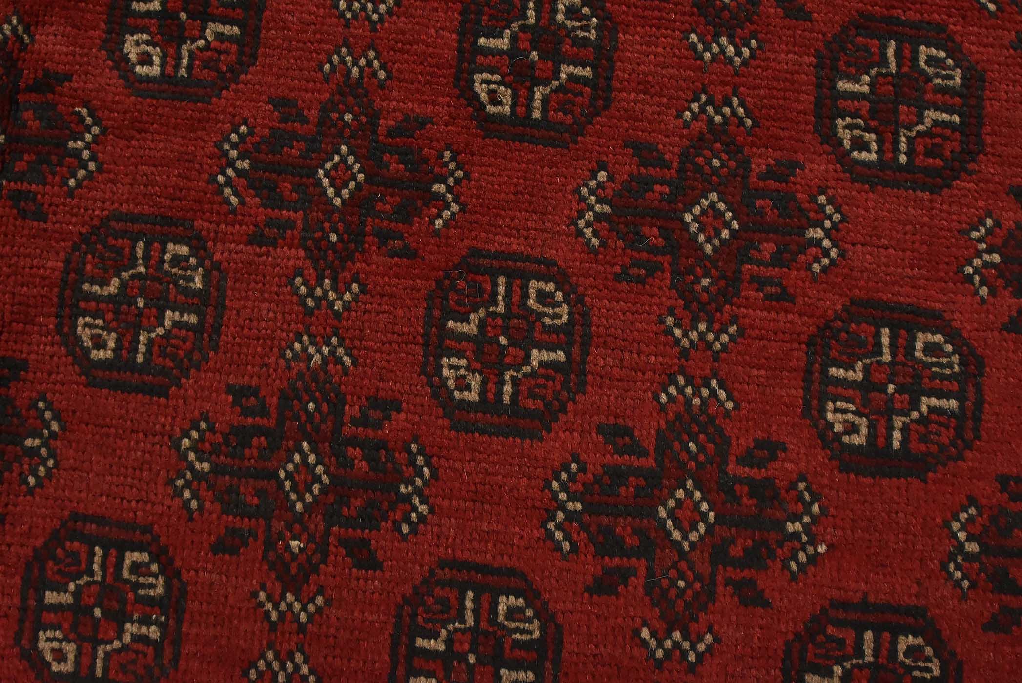 An authentic vintage tribal Turkmen rug hand-knotted with fine wool and natural dyes. This nomadic oriental rug features repeating rows of small-scale geometric medallions set against a red background. It has a full wool pile with no worn areas and is in very good condition.