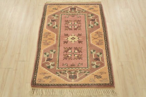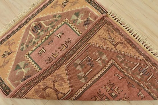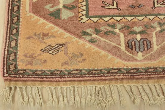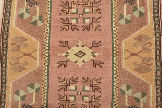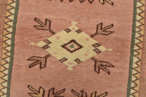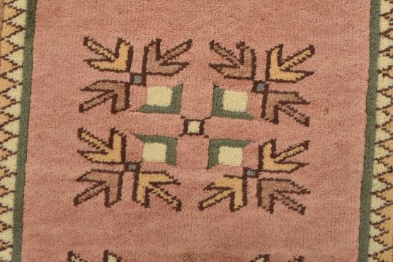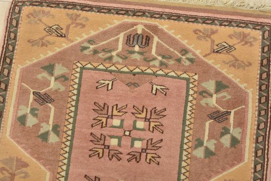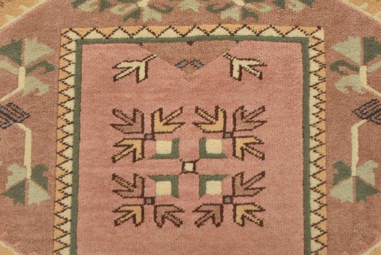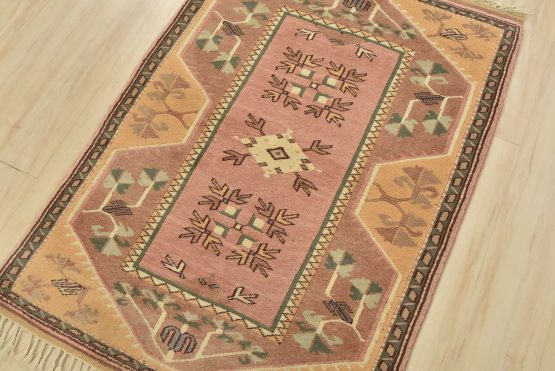 An authentic vintage tribal Milas rug hand-knotted with fine wool and natural dyes. This oriental rug features a small diamond-shaped medallion surrounded by geometric botanical motifs set against a pink background. It has a full wool pile with no worn areas and is in very good condition.