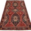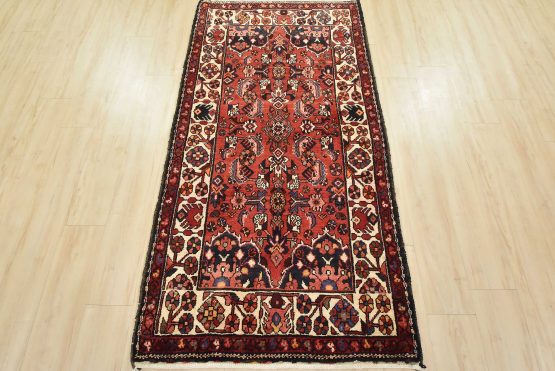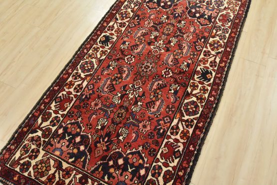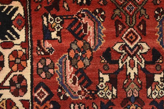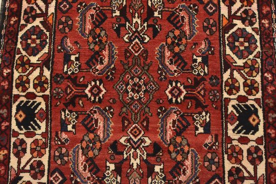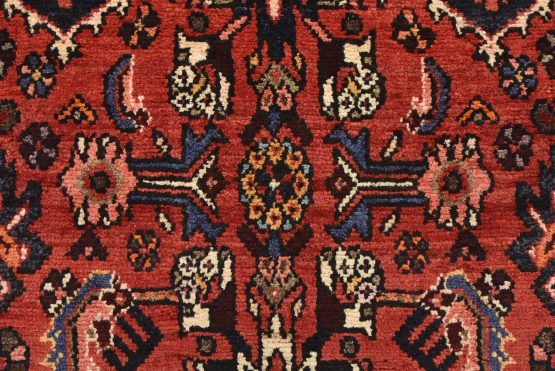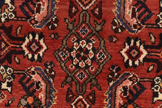 An authentic semi-antique tribal Hamedan rug hand-knotted with fine wool and natural dyes. This nomadic oriental rug features an all-over geometric Herati pattern set against a red background. It has a full wool pile with no worn areas and is in very good condition.