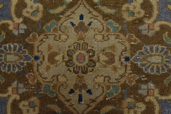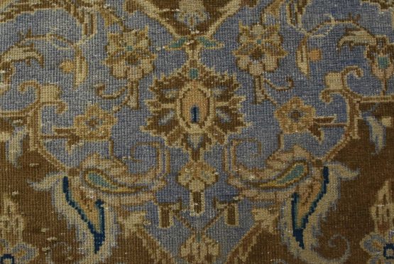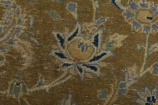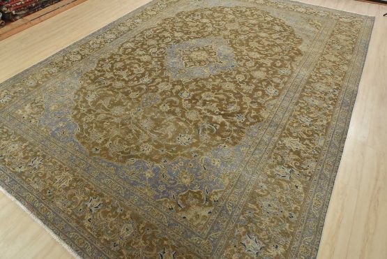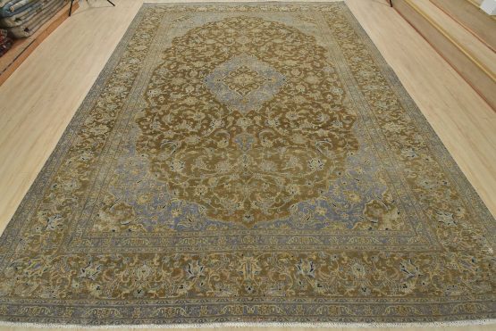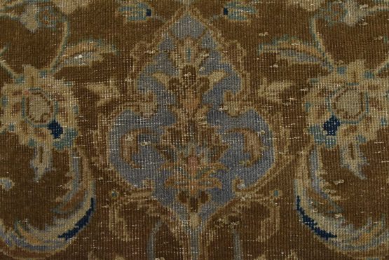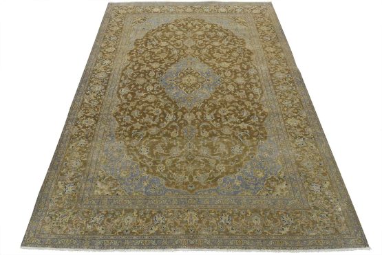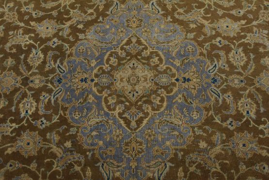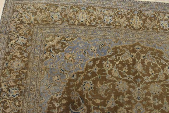 An authentic vintage traditional Kashan rug hand-knotted with an all-wool pile on a cotton foundation. This oriental rug features a central medallion surrounded by floral designs set against a brown background. It has a low wool pile, is worn and distressed, and has minor imperfections (see photos). However, it is in very good condition.