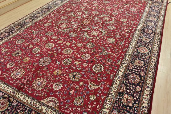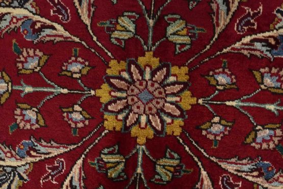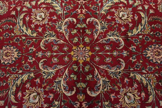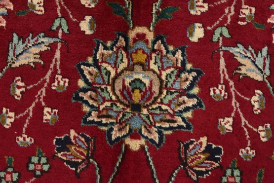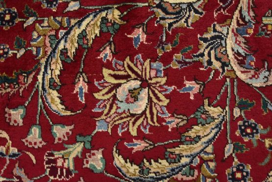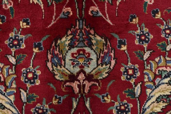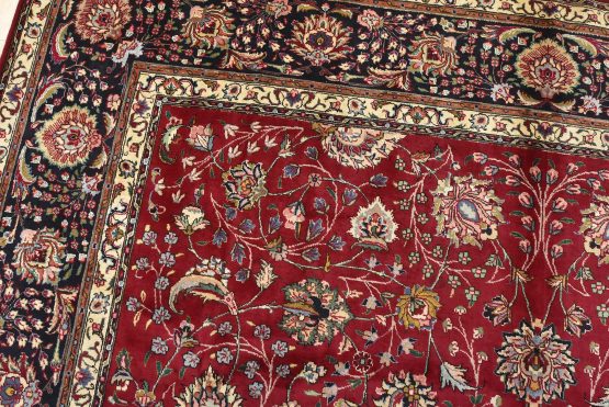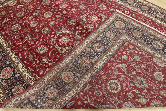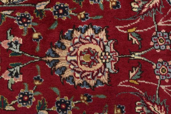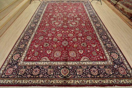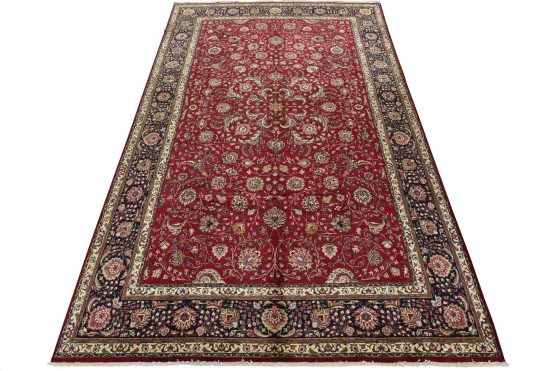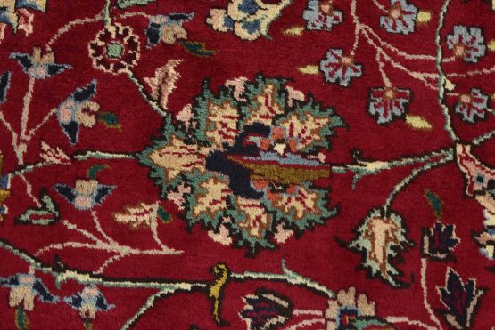 An authentic vintage traditional Tabriz rug hand-knotted with fine wool and natural dyes. This finely woven oriental rug features an intricate all-over floral design set against a red background. This rug has a full wool pile with worn areas and is in very good condition.