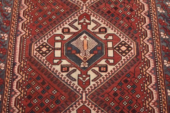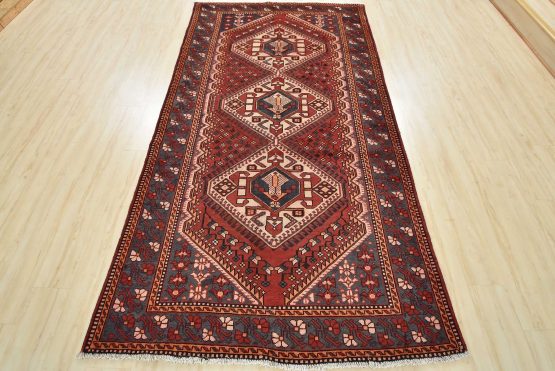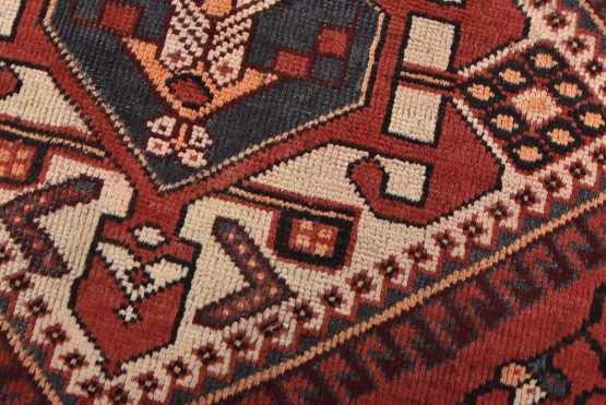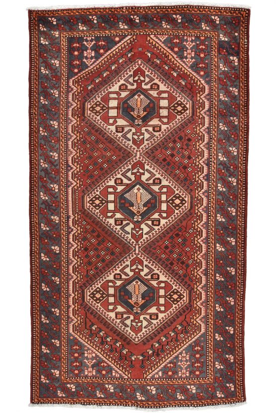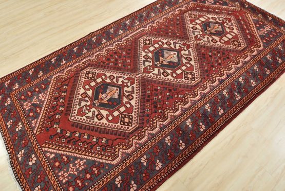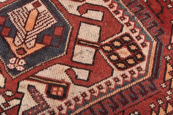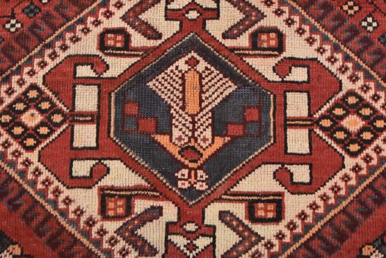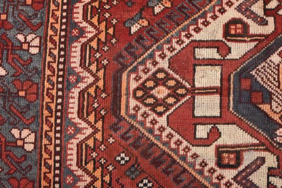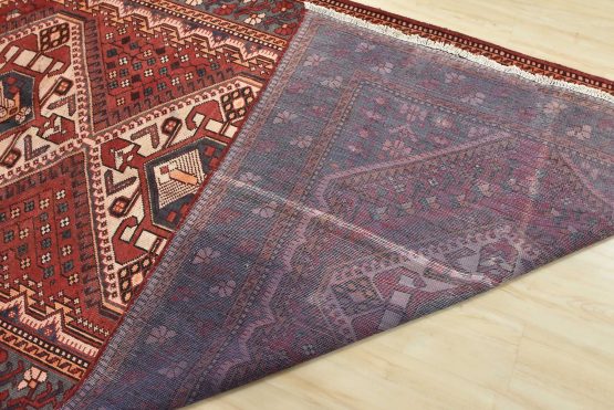 An authentic semi-antique tribal Luri rug hand-knotted with fine wool and natural dyes. This nomadic oriental rug features geometric medallions surrounded by a geometric floral pattern set against a red background. The wool pile does show some minor wear; please refer to the photos. Otherwise, this rug is in very good condition.