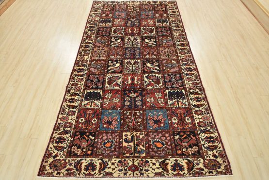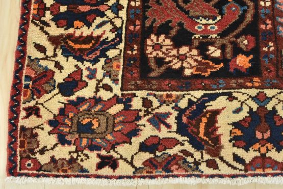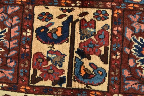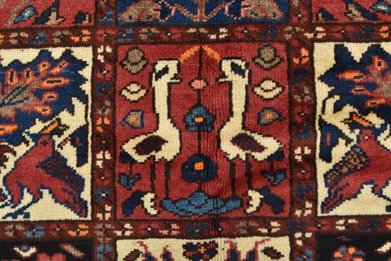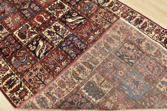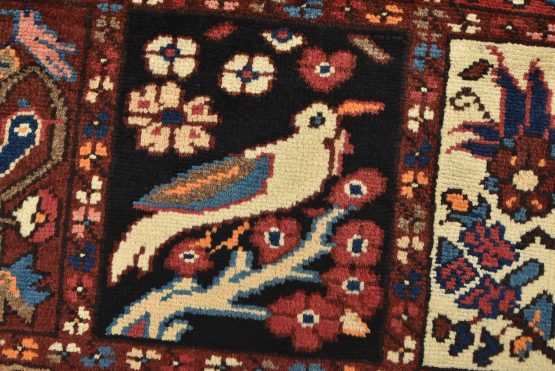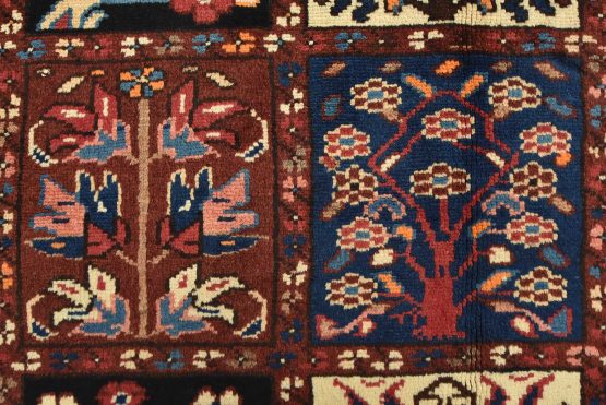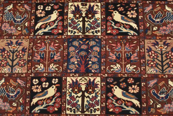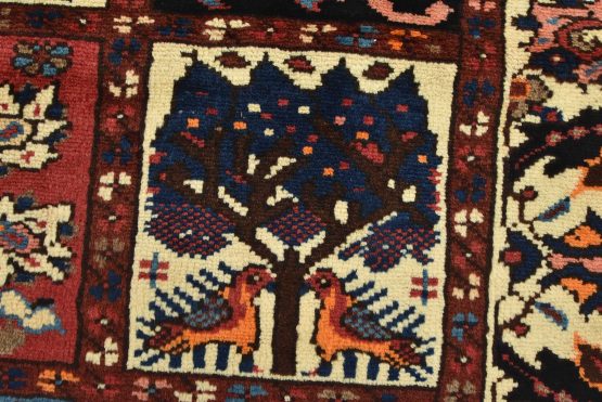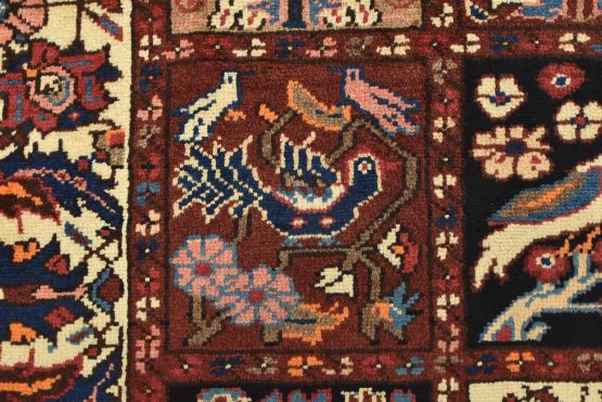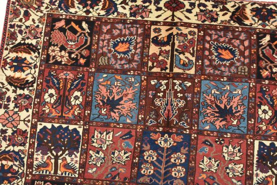 An authentic, semi-antique, traditional tribal Bakhtiari rug, hand-knotted with fine wool and natural dyes. This oriental rug features an all-over panel garden design with floral motifs and birds. It has a full wool pile with no worn areas and is in very good condition.