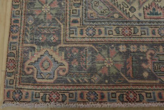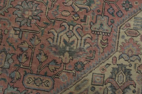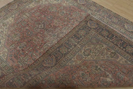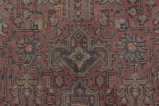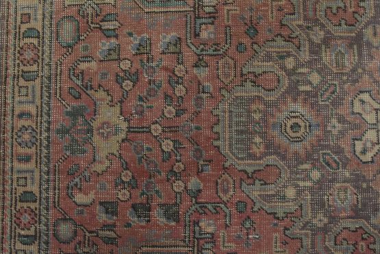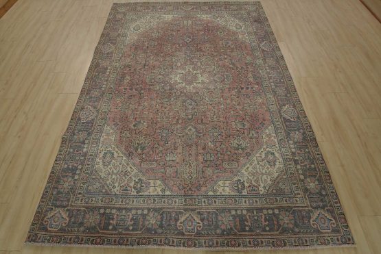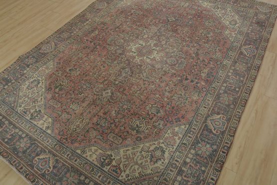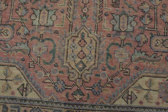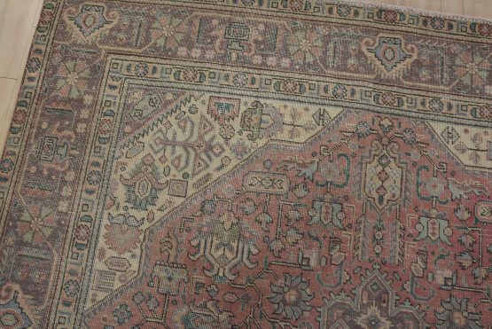 An authentic vintage traditional Tabriz rug hand-knotted with fine wool and natural dyes. This oriental rug features muted colors with a central medallion surrounded by geometric floral design set against a pink background. It has a low wool pile, is worn and distressed, and has minor imperfections (see photos). However, it is in very good condition.