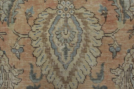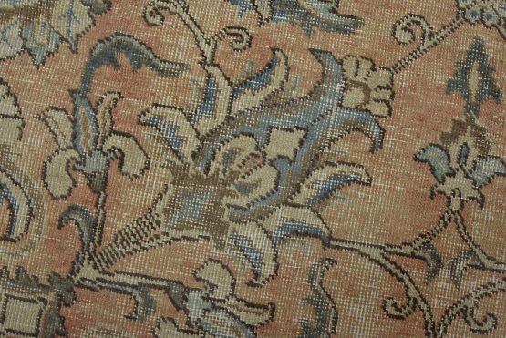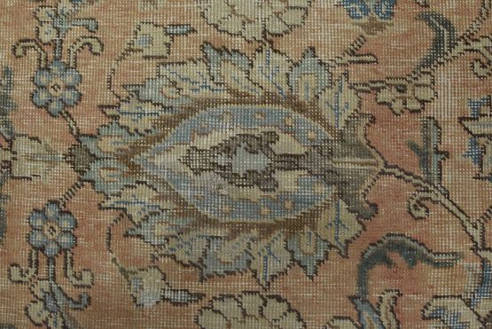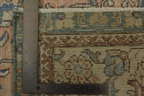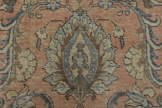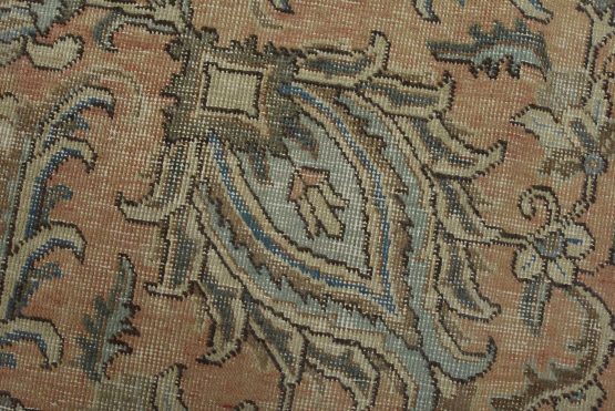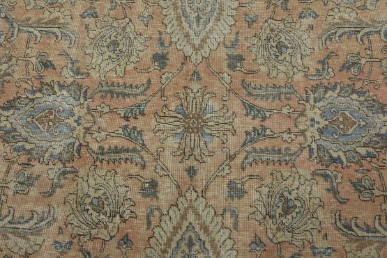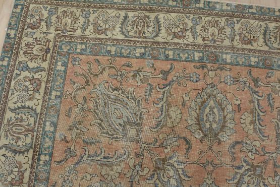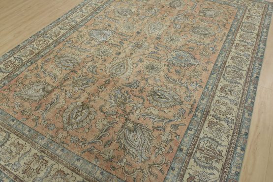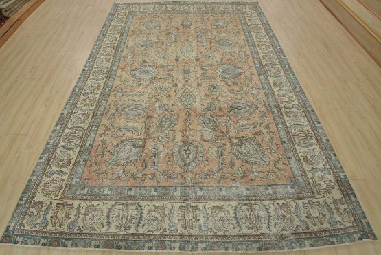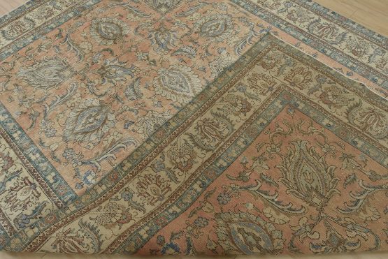 An authentic vintage traditional Tabriz rug hand-knotted with an all-wool pile on a cotton foundation. This oriental rug features an all-over floral design set against a pink background. It has a low wool pile, is worn and distressed, and has minor imperfections (see photos). However, it is in very good condition.