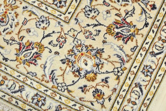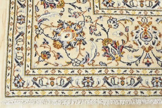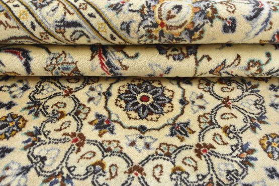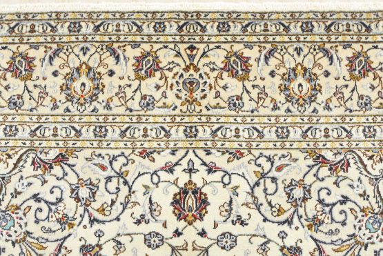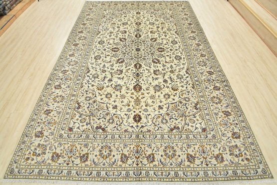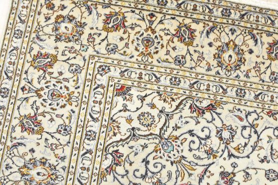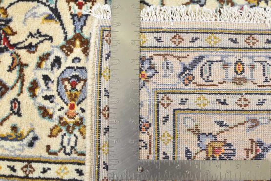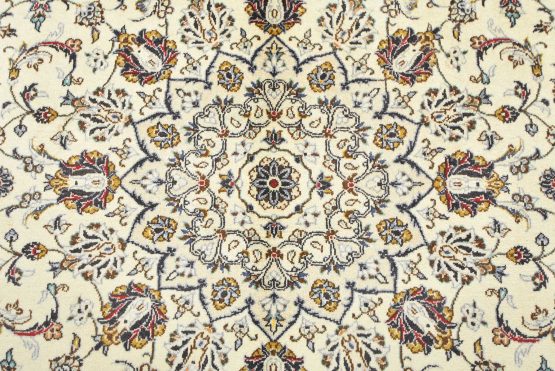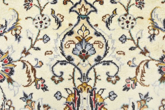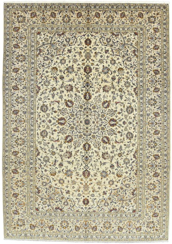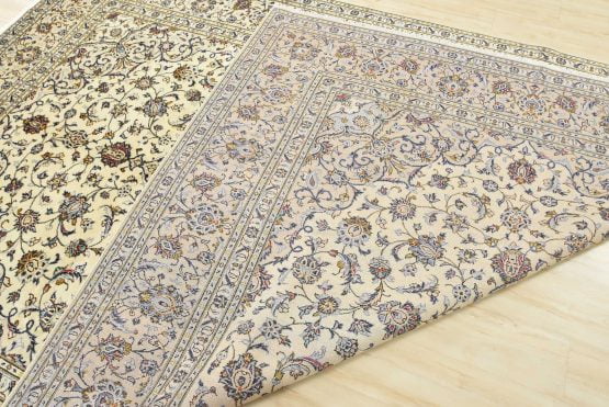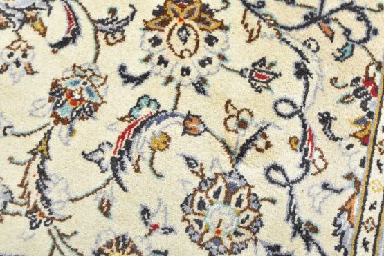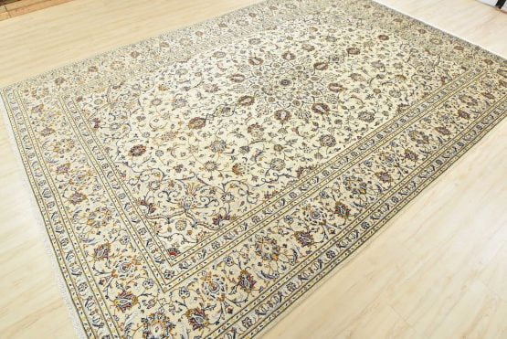 An authentic vintage traditional Kashan rug hand-knotted with fine wool and natural dyes. This oriental rug features a central medallion surrounded by a curvilinear floral pattern set against an ivory background. It has a full wool pile with no worn areas and is in very good condition.