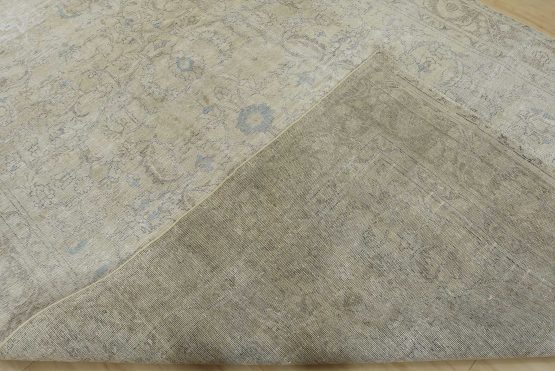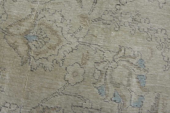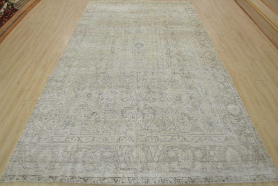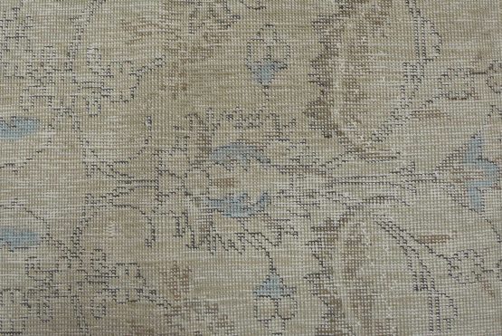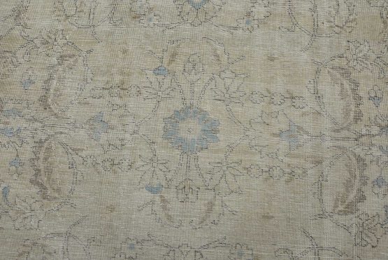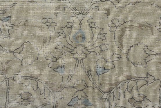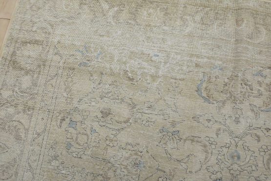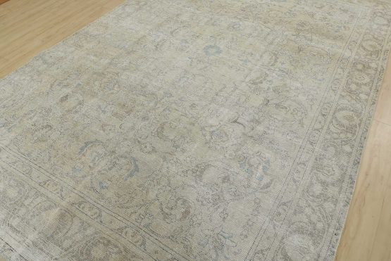 An authentic vintage traditional Tabriz rug hand-knotted with an all-wool pile on a cotton foundation. This rug features a muted all-over floral design set against a beige background. It has a low wool pile, is worn and distressed, and has minor imperfections (see photos). However, it is in very good condition.