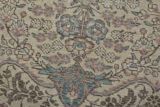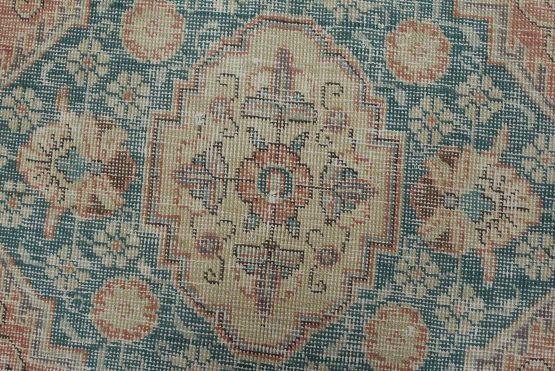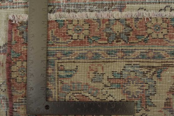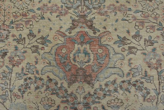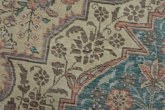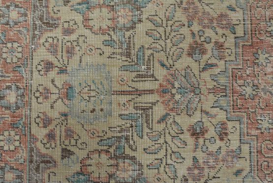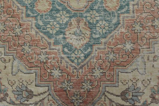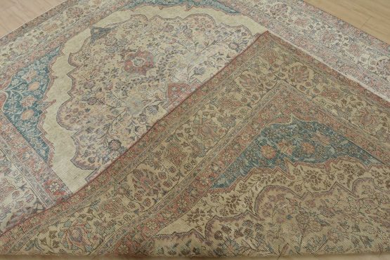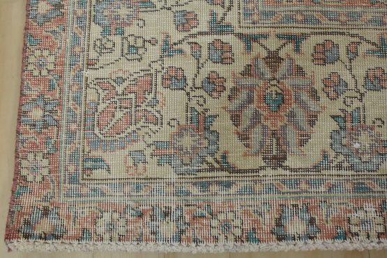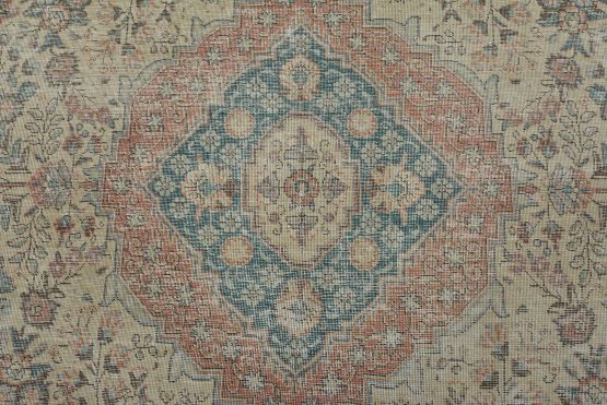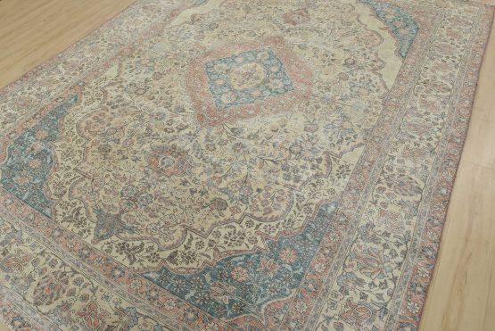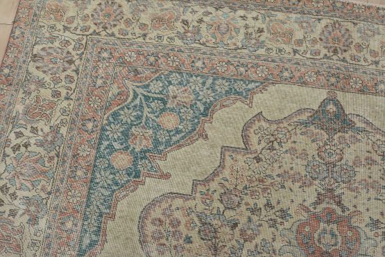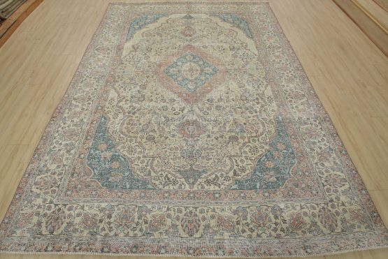 An authentic vintage traditional Tabriz rug hand-knotted with fine wool and natural dyes. This oriental rug features muted colors with a central medallion surrounded by floral designs set against an ivory background. It has a low wool pile, is worn and distressed, and has minor imperfections (see photos). However, it is in very good condition.