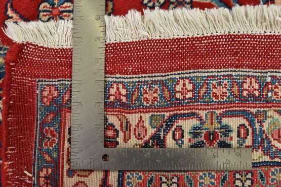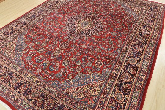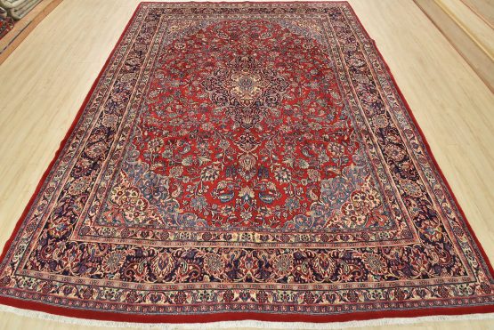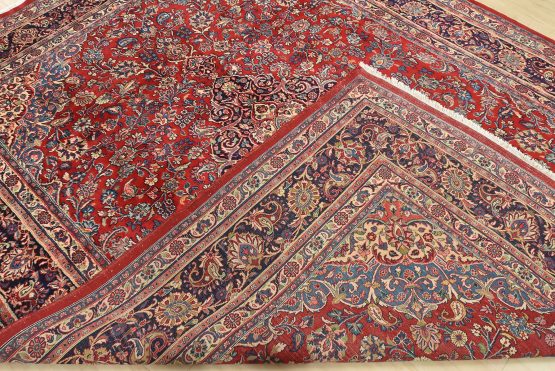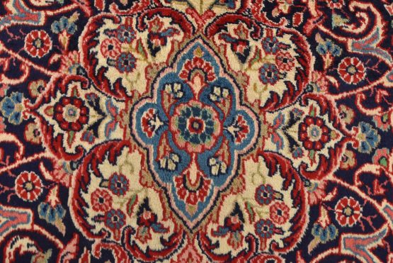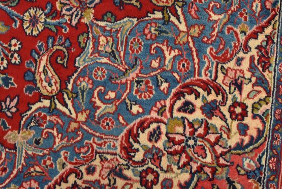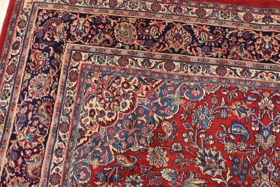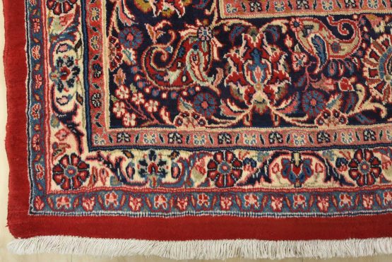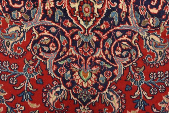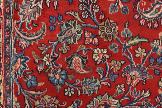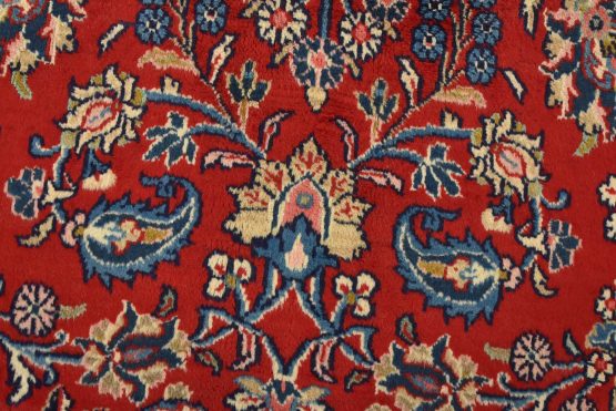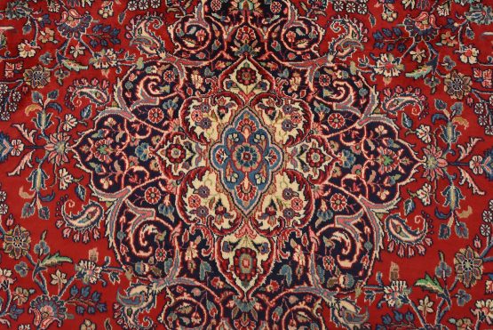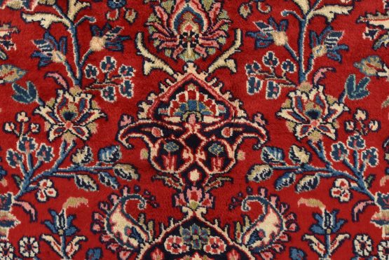An authentic vintage traditional Sarouk rug hand-knotted with fine wool and natural dyes. This finely woven oriental rug features a central medallion surrounded by floral designs set against a red background. It has a full wool pile with no worn areas and is in very good condition.