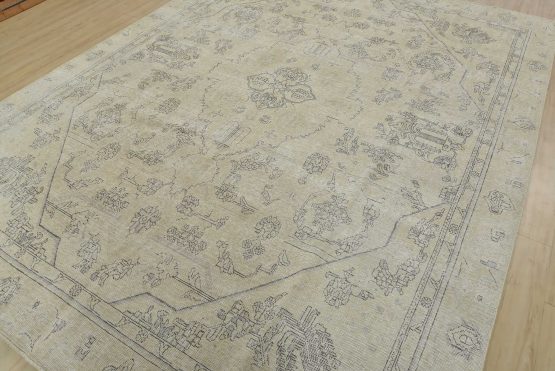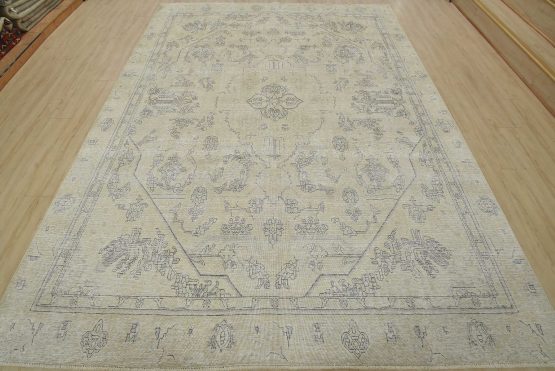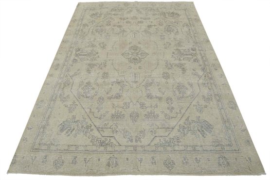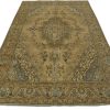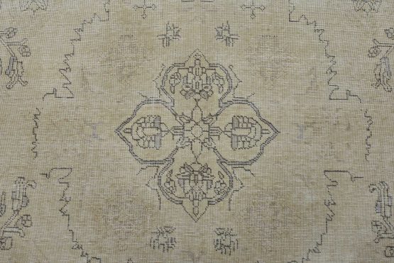 This authentic vintage traditional Tabriz rug is hand-knotted with an all-wool pile on a cotton foundation. This rug features a muted central medallion surrounded by subtle floral motifs set against a beige background. It has a low wool pile, is worn and distressed, and has minor imperfections (see photos). However, it is in very good condition.
