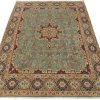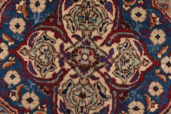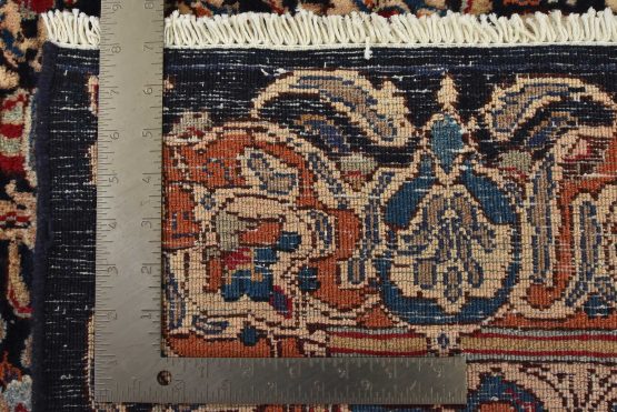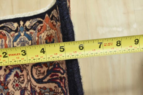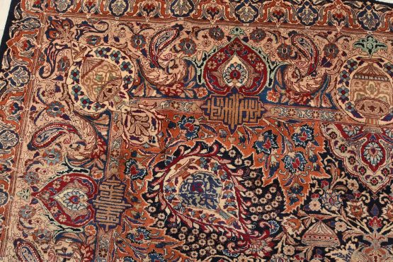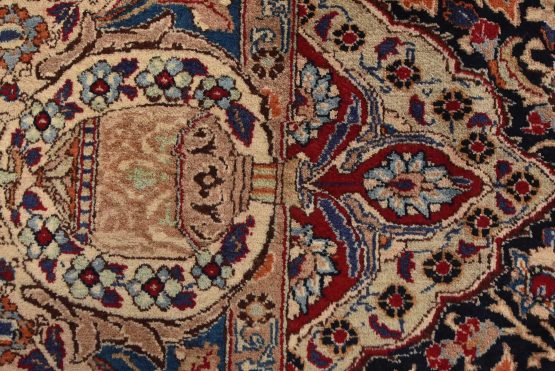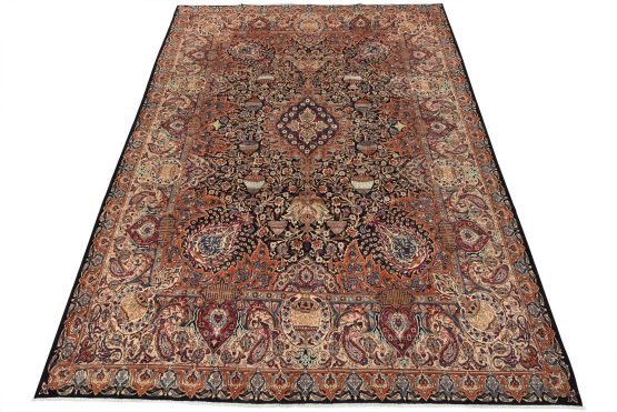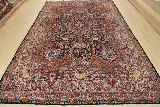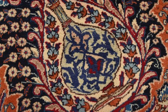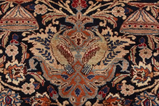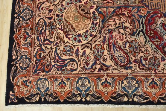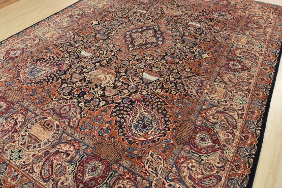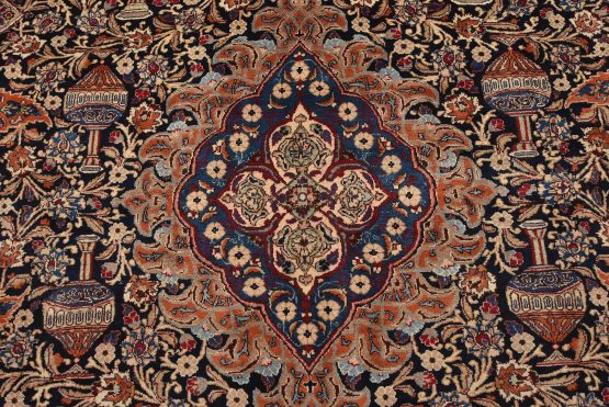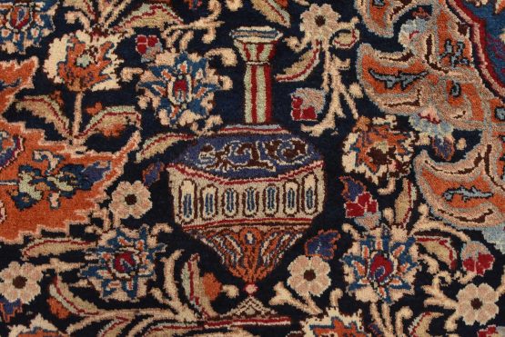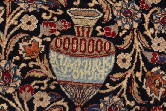 An authentic vintage traditional Kashmar rug hand-knotted with fine wool and natural dyes. This finely woven oriental rug features an oval-shaped medallion surrounded by vases and botanical floral designs set against a dark blue background. It has a full wool pile with no worn areas and is in very good condition.