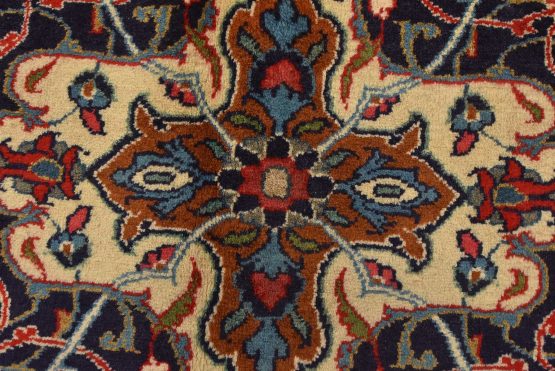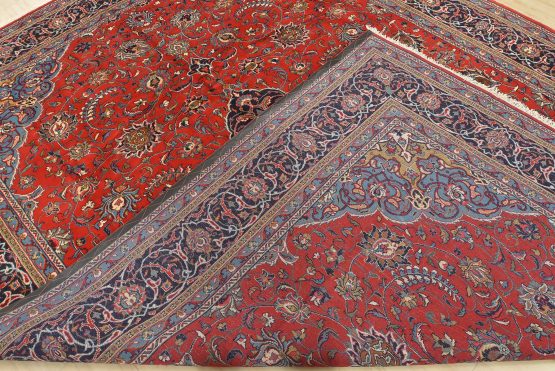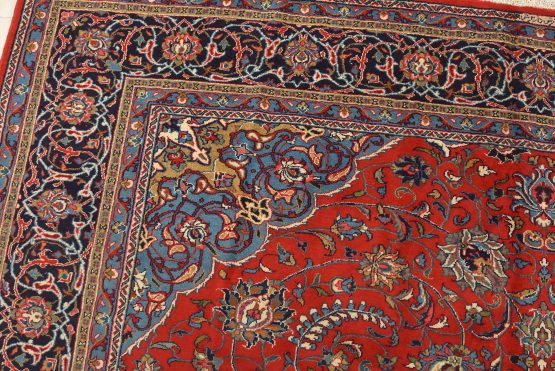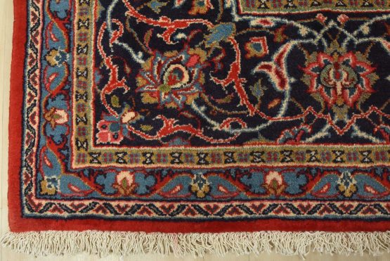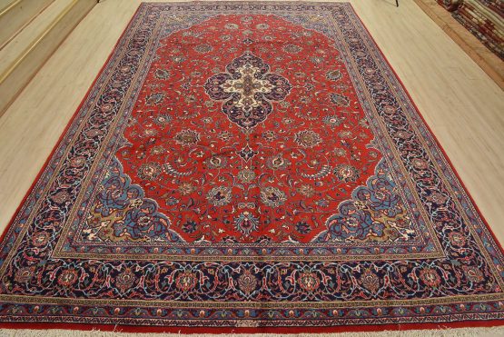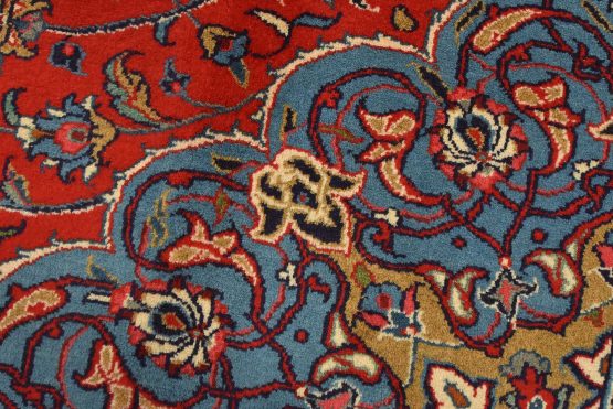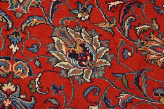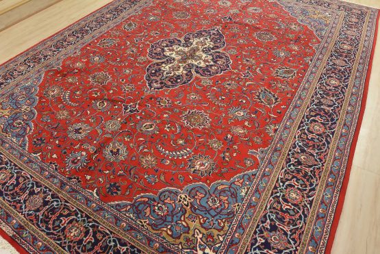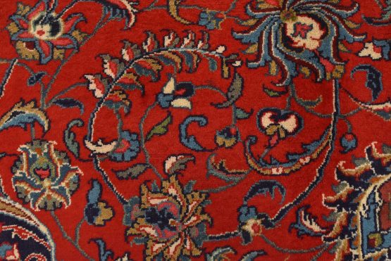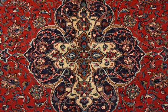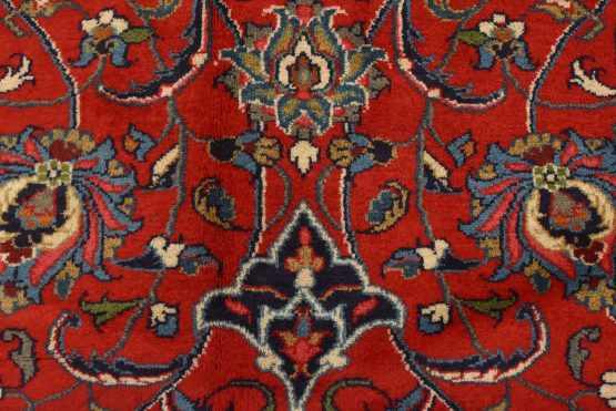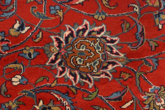 An authentic vintage traditional Sarouk rug hand-knotted with an all-wool pile on a cotton foundation. This finely woven oriental rug features a central curvilinear medallion surrounded by floral motifs set against a red background. It has a full wool pile with no worn areas and is in very good condition.