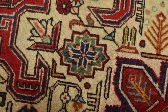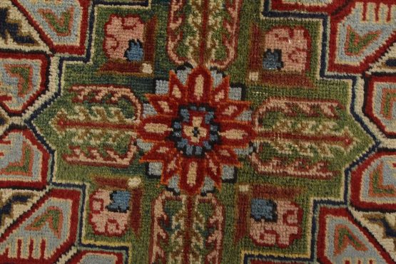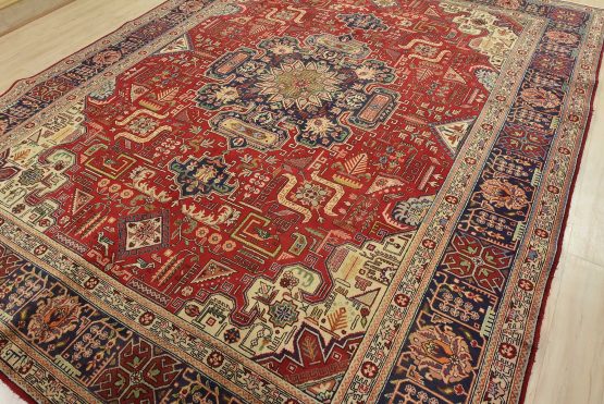 An authentic traditional semi-antique Tabriz rug hand-knotted with fine wool and natural dyes. This oriental rug features a central medallion surrounded by geometric bird and floral motifs set against a red background. The wool pile shows some minor wear; please refer to the photos. Otherwise, the rug is in very good condition.