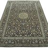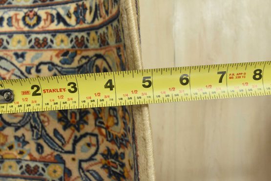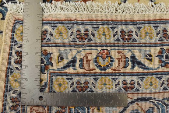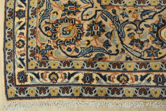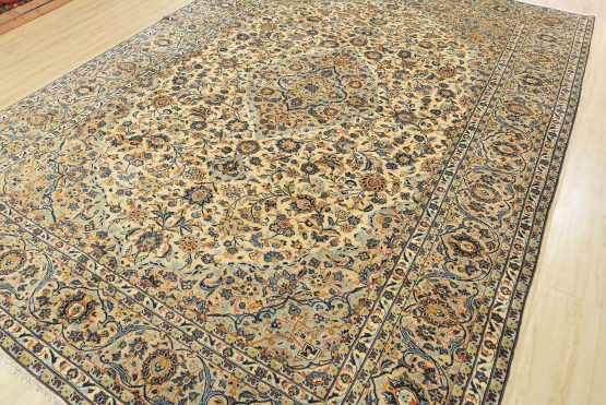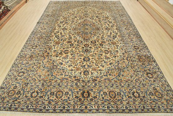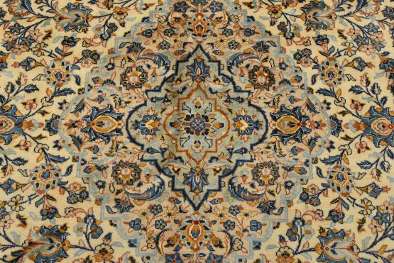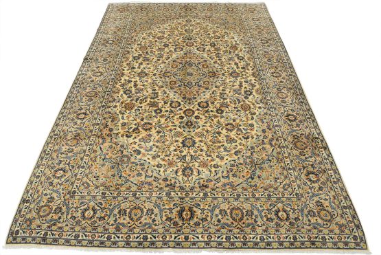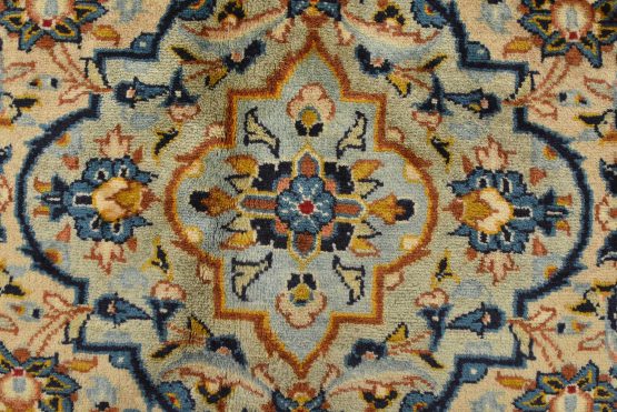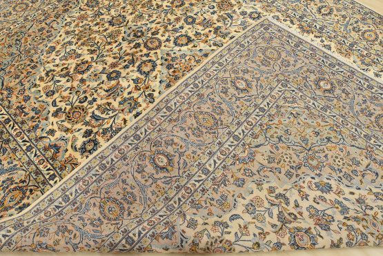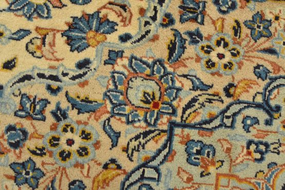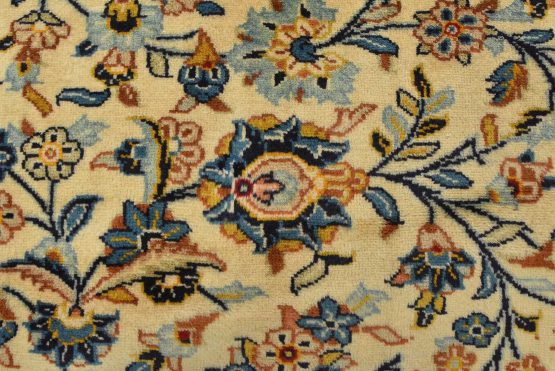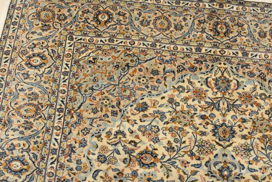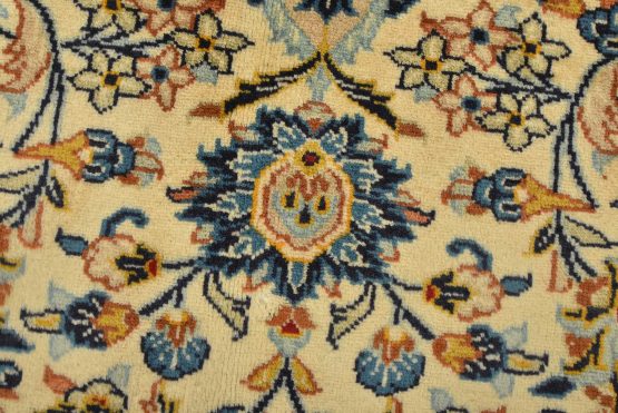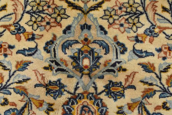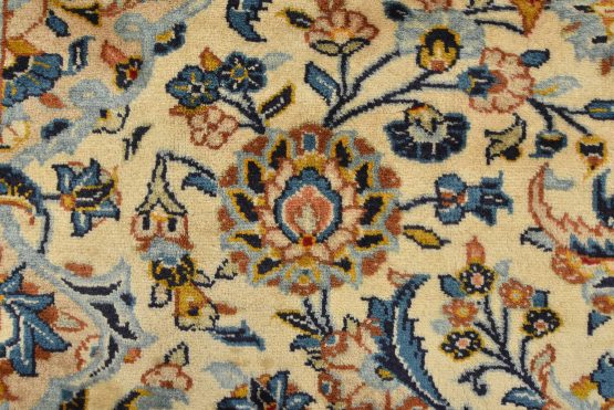 An authentic vintage traditional Kashan rug hand-knotted with fine wool and natural dyes. This finely woven oriental rug features a central medallion surrounded by intricate floral designs set against an ivory background. It has a full wool pile with no worn areas and is in very good condition.