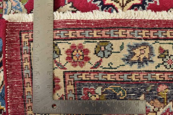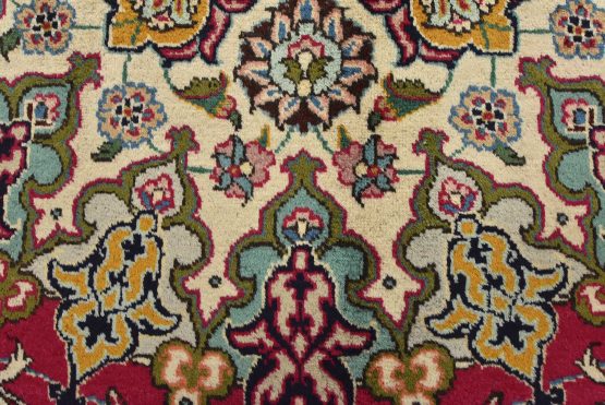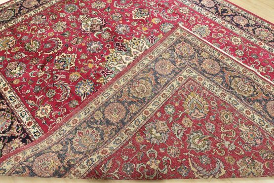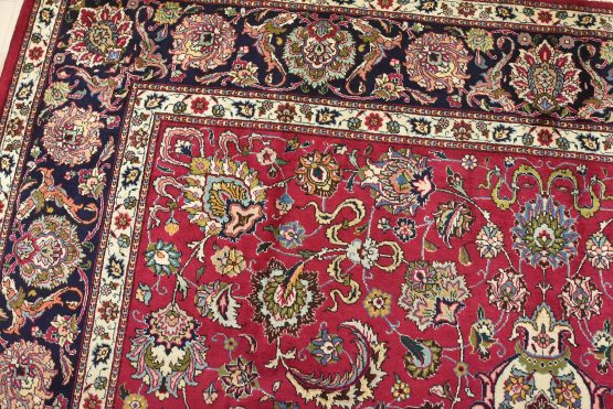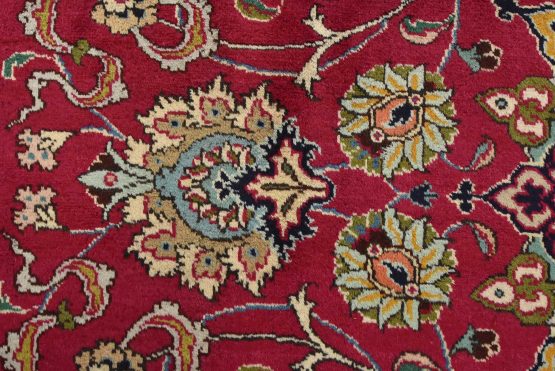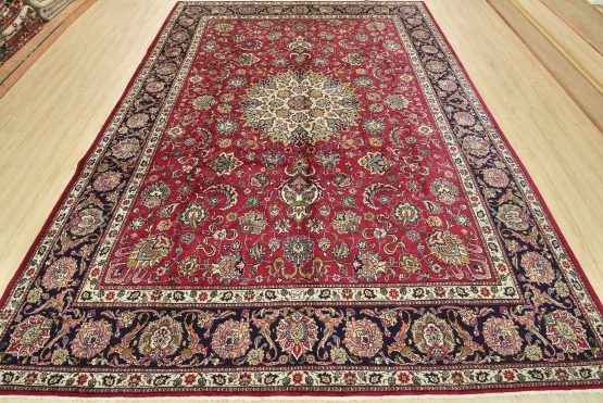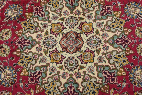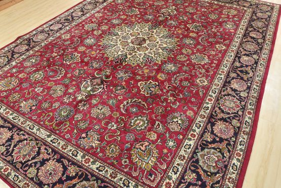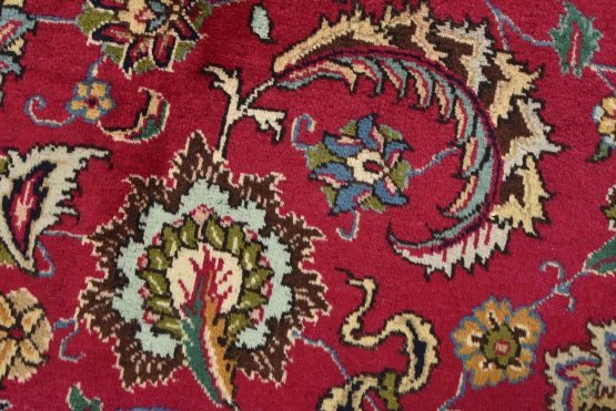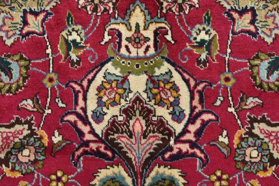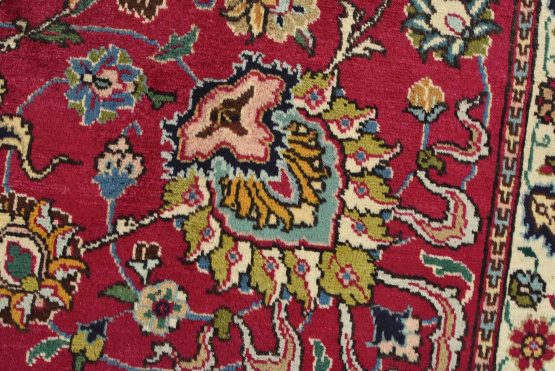 An authentic vintage traditional Tabriz rug hand-knotted with fine wool and natural dyes. This finely woven oriental rug features a central medallion surrounded by intricate floral motifs set against a red background. It has a full wool pile with no worn areas and is in very good condition.