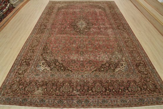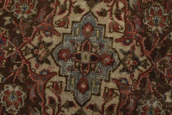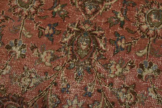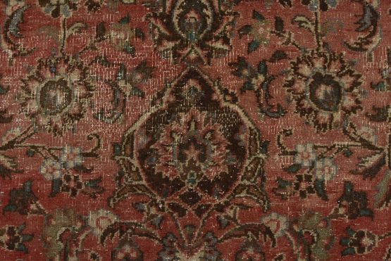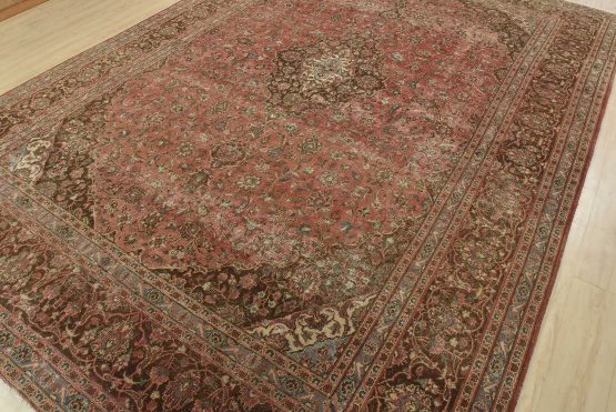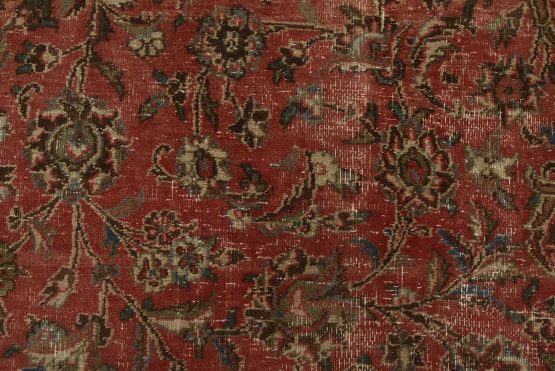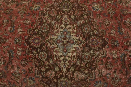 An authentic vintage traditional Kashan rug hand-knotted with fine wool and natural dyes. This oriental rug features a central medallion surrounded by floral designs set against a red background. It has a low wool pile, is worn and distressed, and has minor imperfections (see photos). However, it is in very good condition.