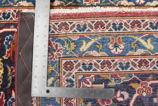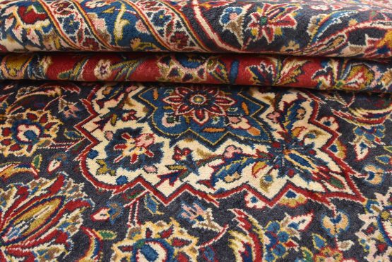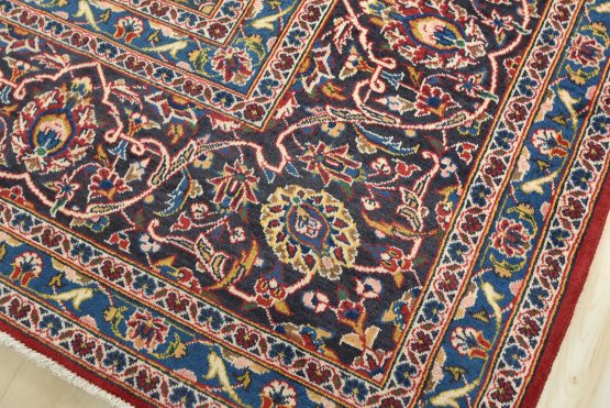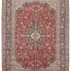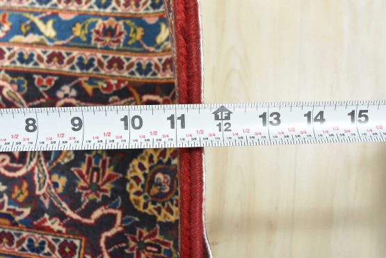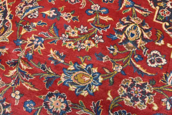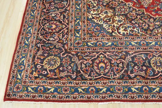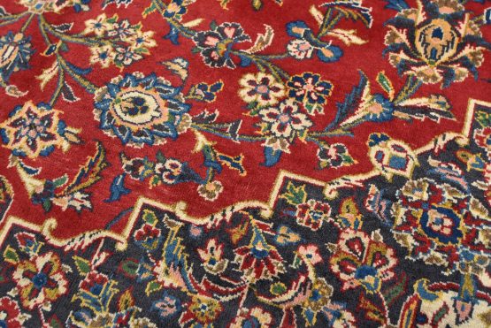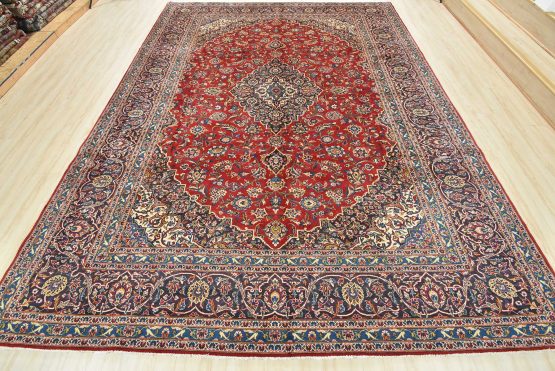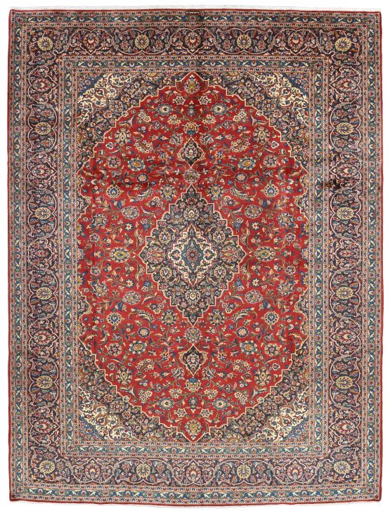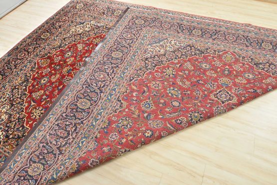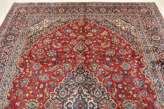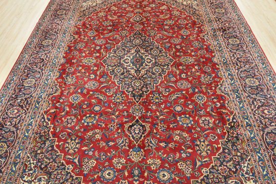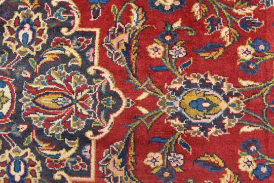 An authentic vintage traditional Kashan rug hand-knotted with fine wool and natural dyes. This oriental rug features a central medallion surrounded by an intricate floral design set against a red background. The wool pile does show some minimal wear; please refer to the photos. Otherwise, this rug is in very good condition.