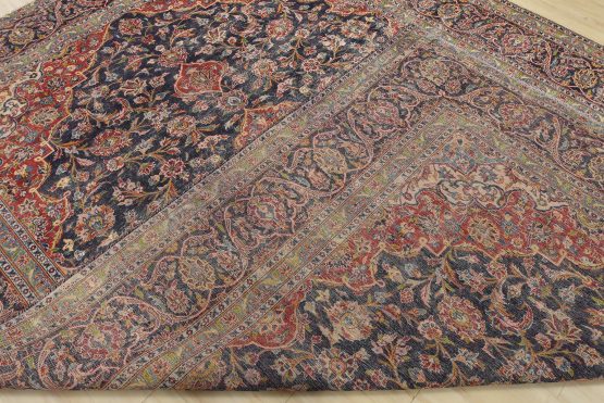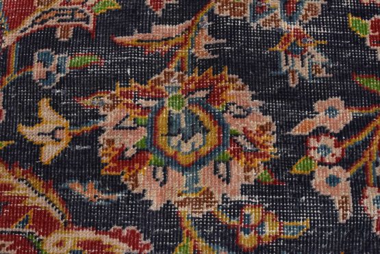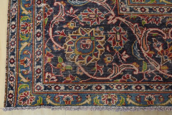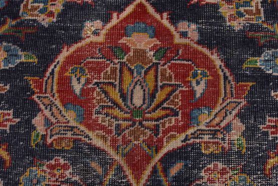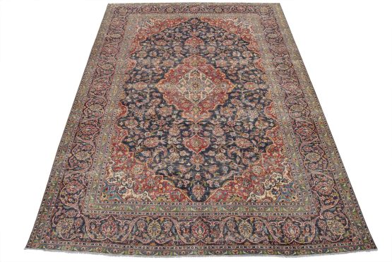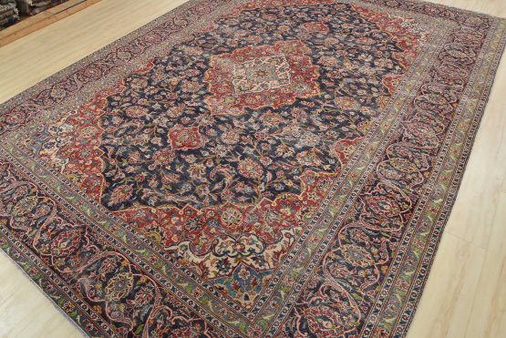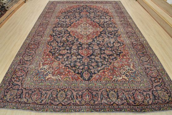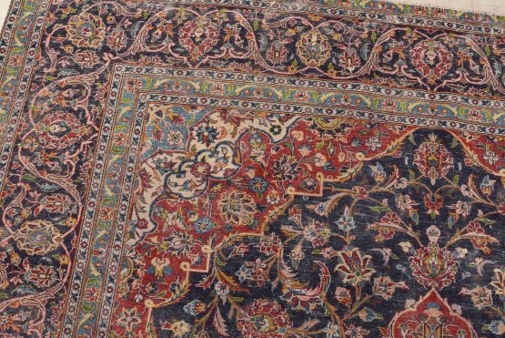 Kashan Rug 9’9” x 12’10” Blue Wool Vintage Distressed Hand-Knotted Carpet
