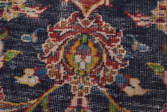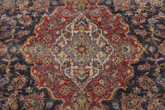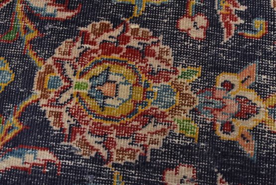 An authentic vintage traditional Kashan rug hand-knotted with fine wool and natural dyes. This oriental rug features a central medallion surrounded by a floral design set against a blue background. It has a low wool pile, is worn and distressed, and has minor imperfections (see photos). However, it is in very good condition.