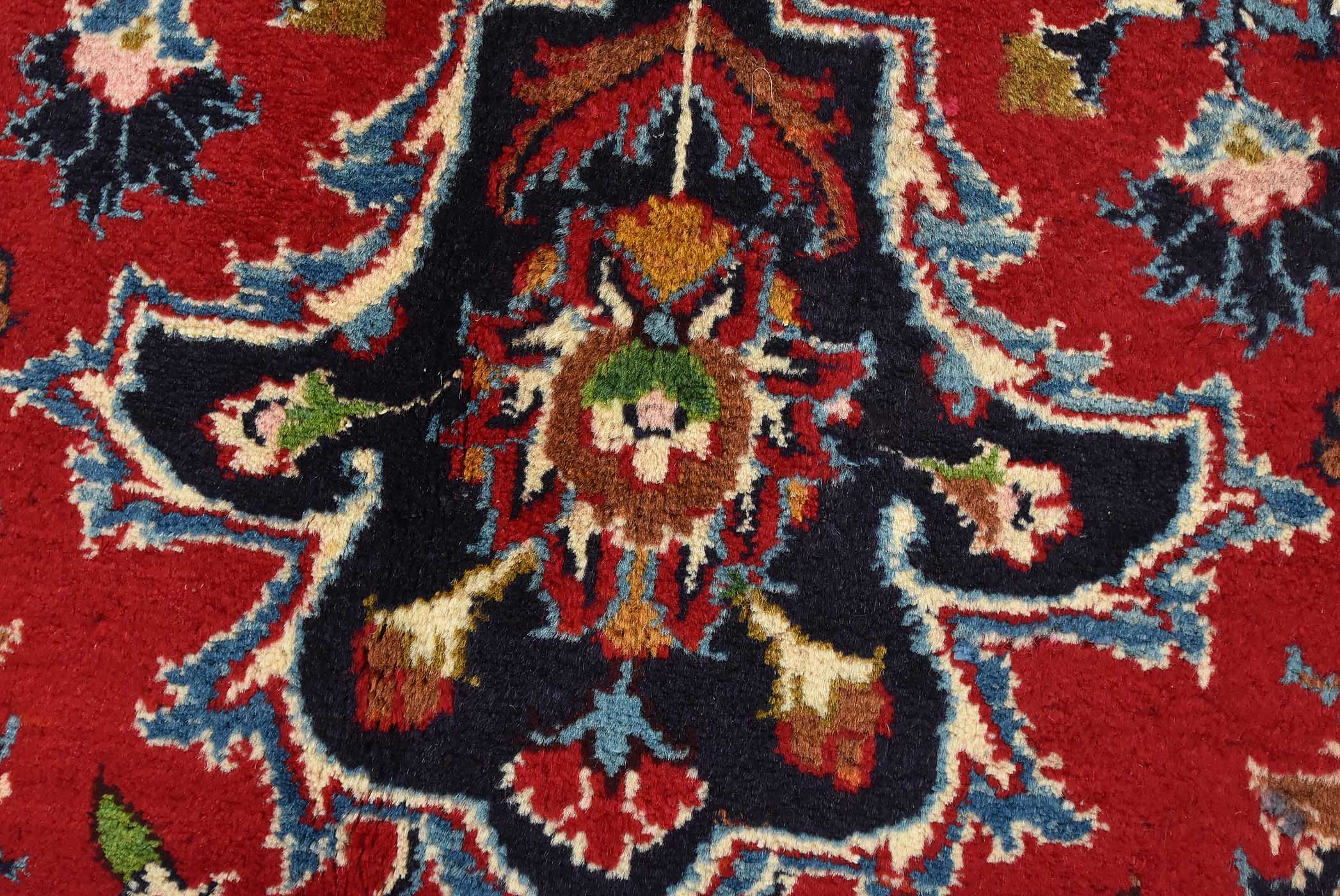 An authentic vintage traditional Mashad rug hand-knotted with fine wool and natural dyes. This oriental rug features a central medallion surrounded by floral designs set against a red background. It has a full wool pile with no worn areas and is in very good condition.