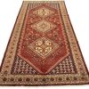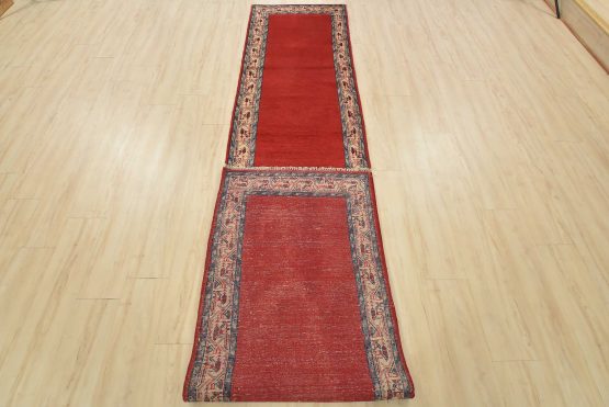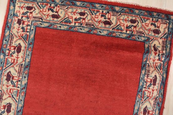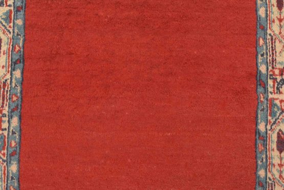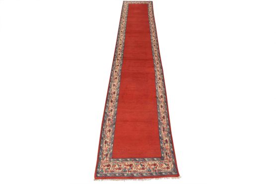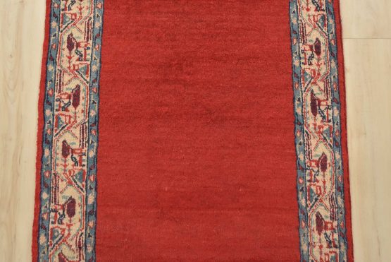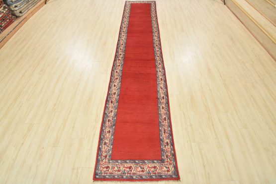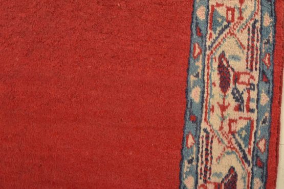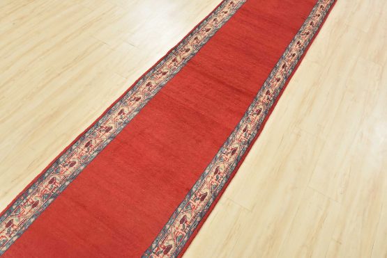 An authentic vintage tribal Mir runner hand-knotted with fine wool and natural dyes. This nomadic oriental rug features a solid red background surrounded by a geometric border pattern. It has a full wool pile with no worn areas and is in very good condition.